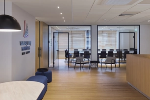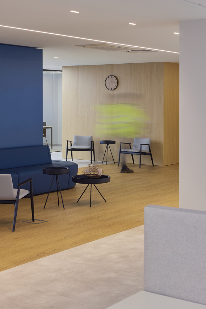The representative area conceals a kitchenette and wardrobe, leaving guests with a clean space centred around a bar-height table for informal meetings. Additionally, a multifunctional meeting room accommodates up to 50 people and can be flexibly divided into two separate offices, allowing adaptation to various work scenarios while maintaining functionality and acoustic comfort.