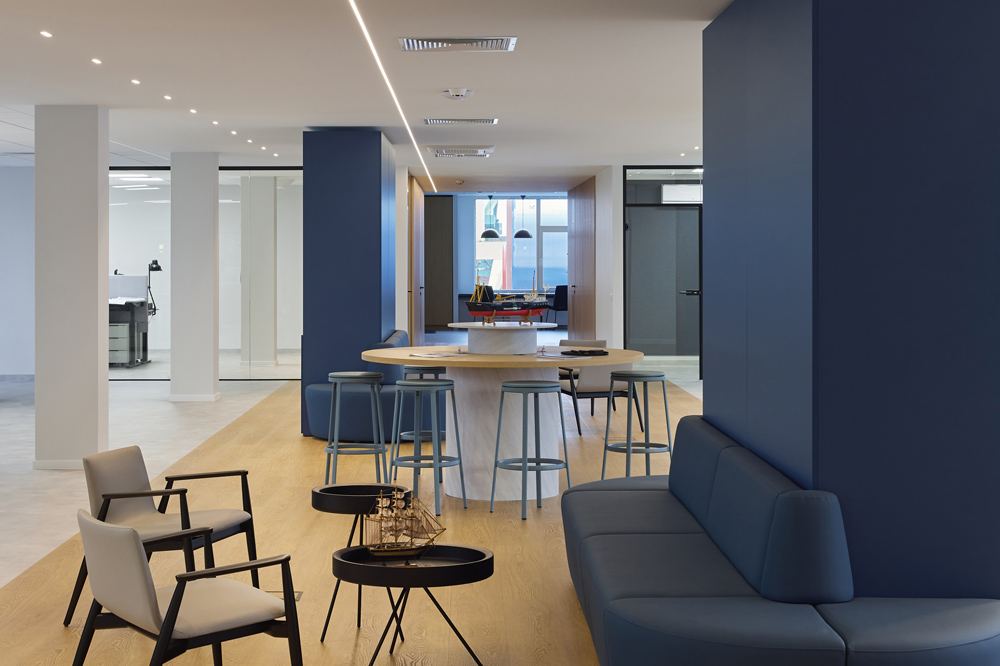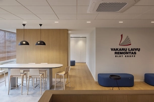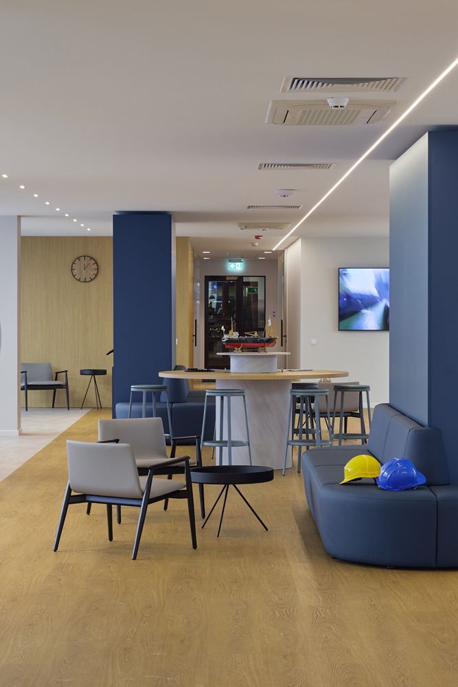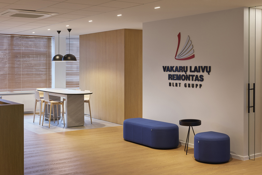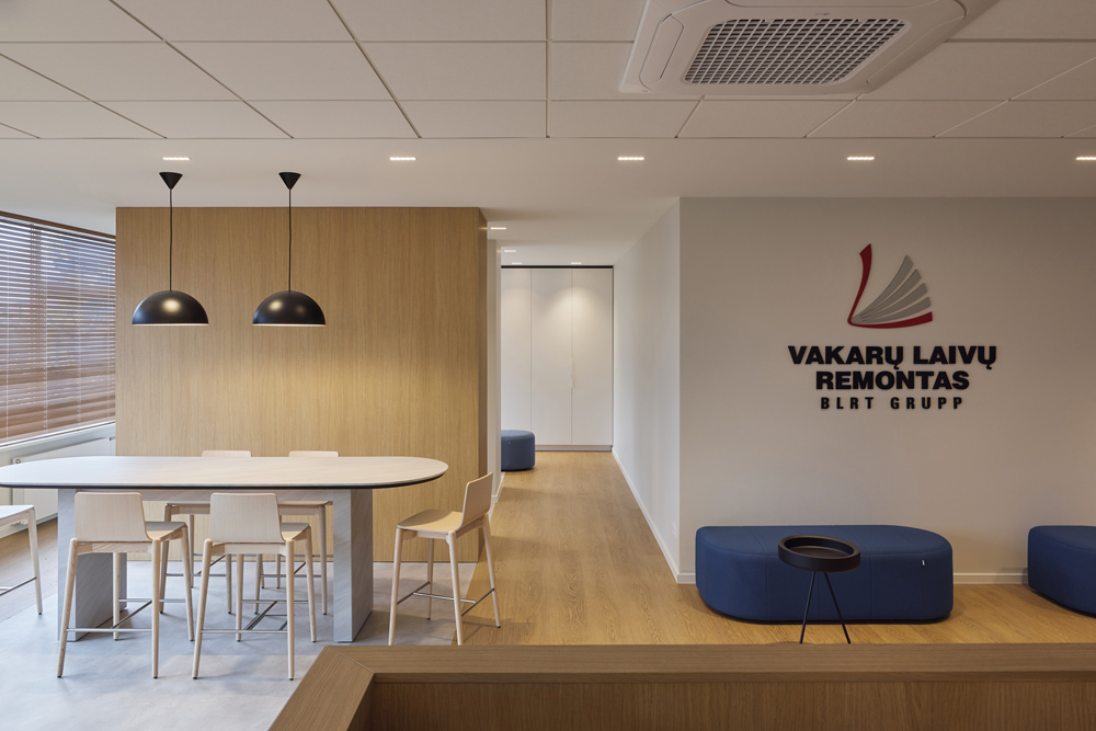Šio biuro interjeras kurtas atsižvelgiant į specifinę įmonės veiklą – tai laivų remonto bendrovė, kurios darbuotojai nuolat juda tarp vidaus ir lauko erdvių: dirbama biure, išeinama prie laivų, tikrinami gamybos procesai ir vėl grįžtama į administracines patalpas. Biuras įsikūręs sename pastate, todėl projektavimo užduotis apėmė ne tik funkcinius, bet ir kontekstinius sprendinius.