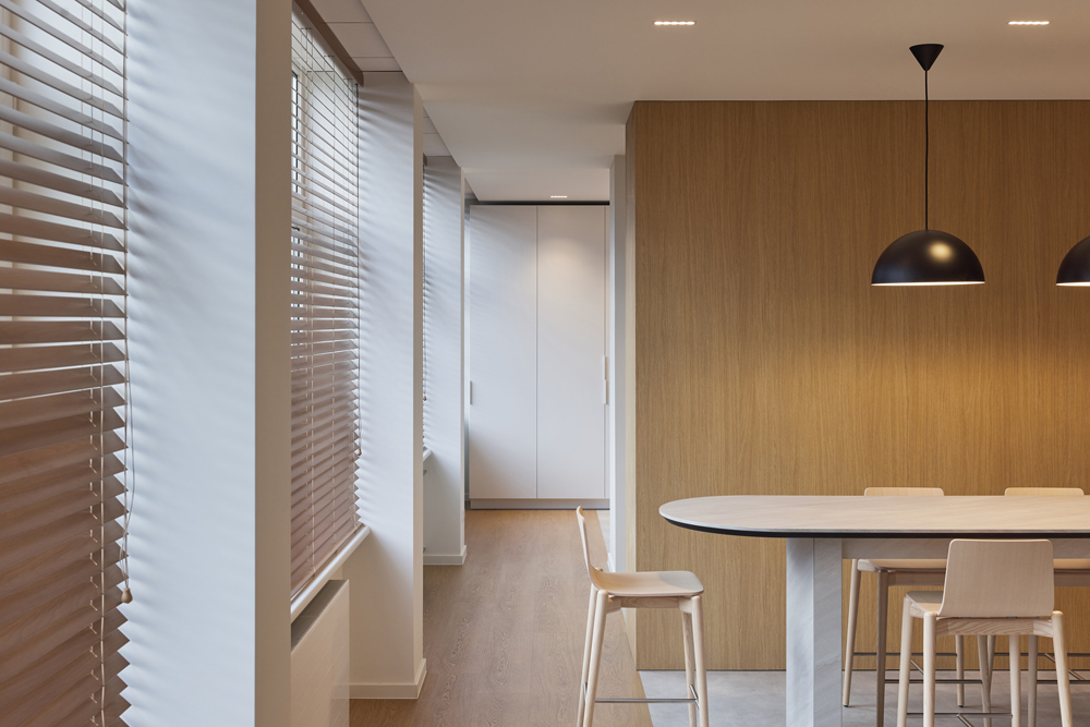 A separate area is dedicated to representation and guest reception, separated by sliding glass doors that maintain visual connection while ensuring privacy. In response to the industrial surroundings, the interior was designed to be warm and uncluttered, complementing the strong exterior context.