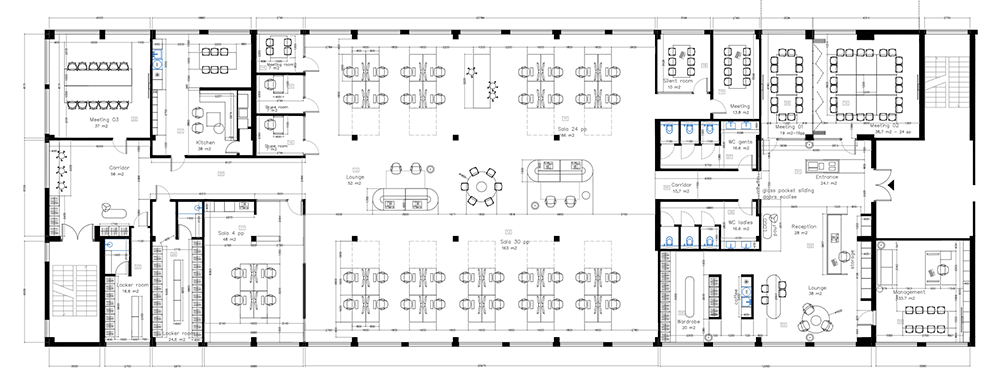 The main goal was to create an open-plan workspace while allowing work in smaller groups, as the workflow is team-based. Workstations are visually divided using shared seating furniture and storage elements that act as partitions without fully enclosing the space.