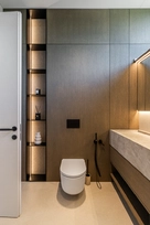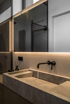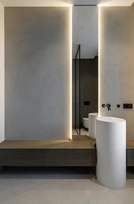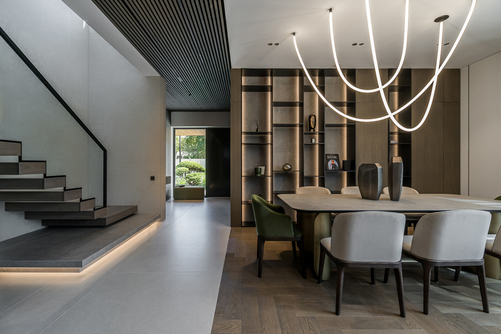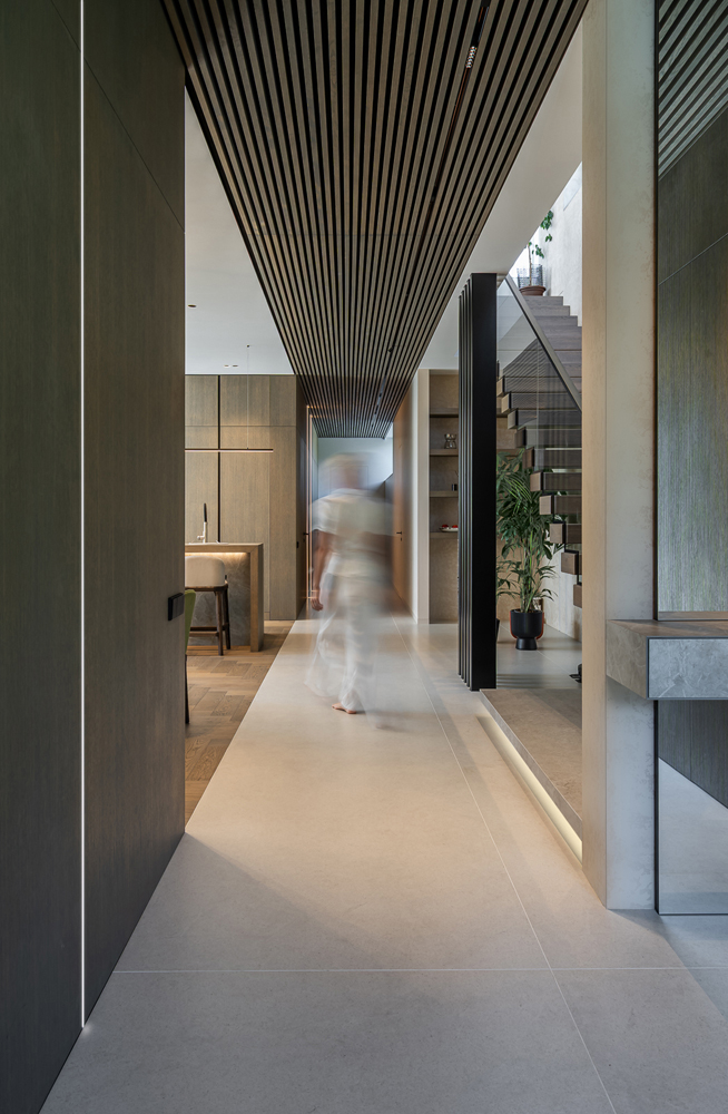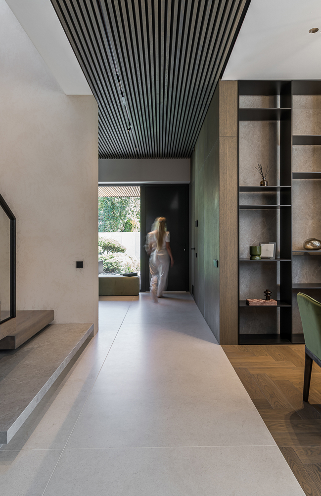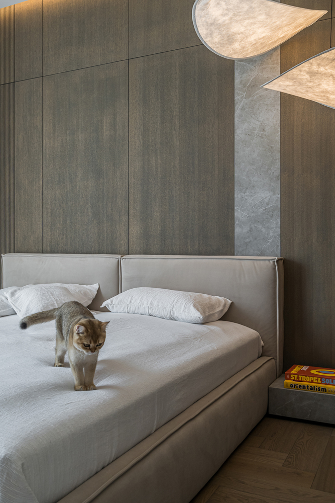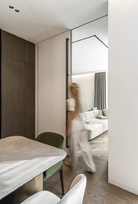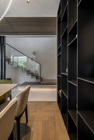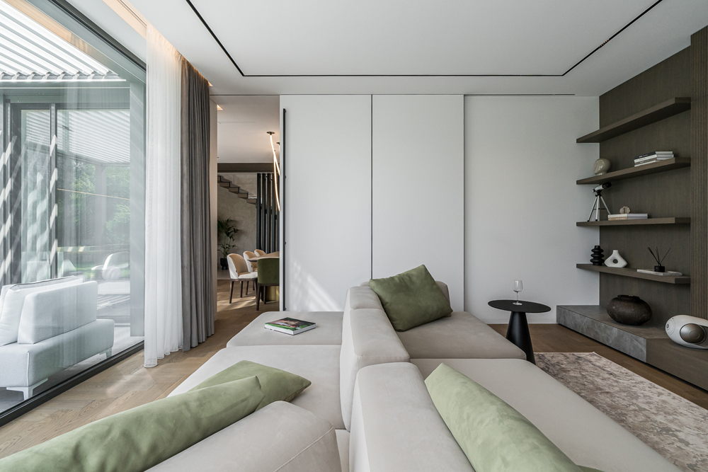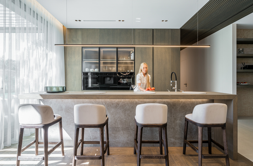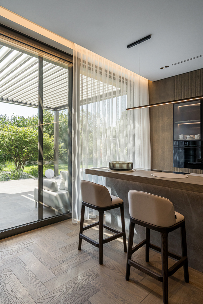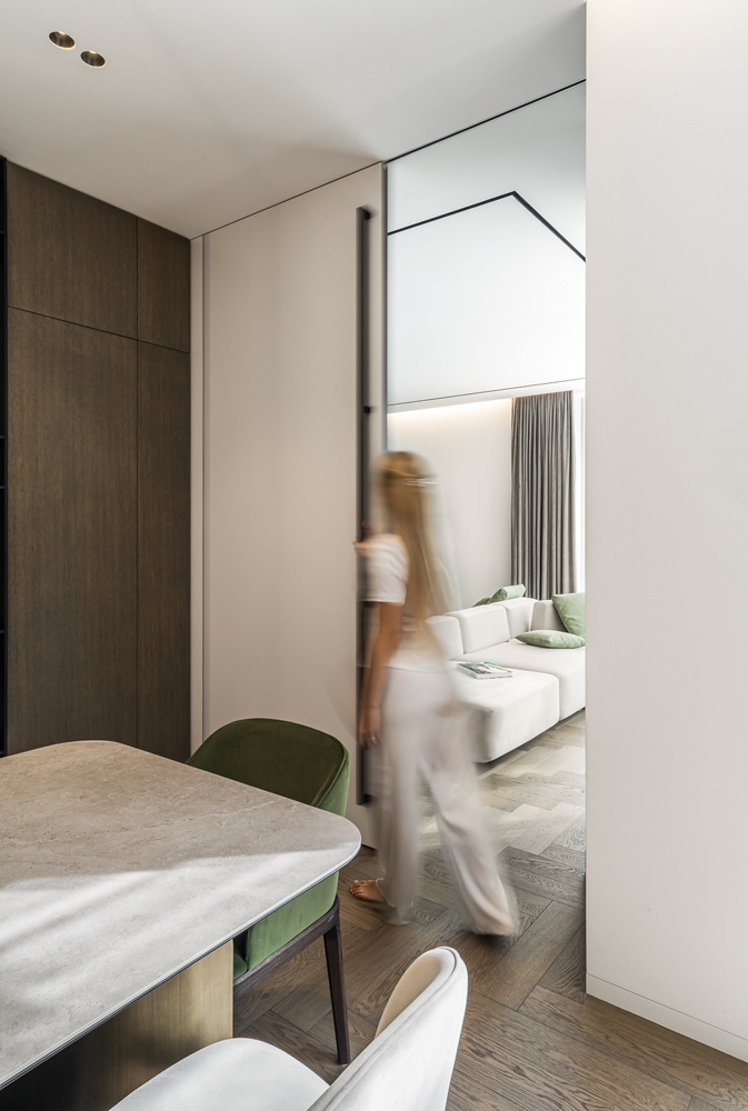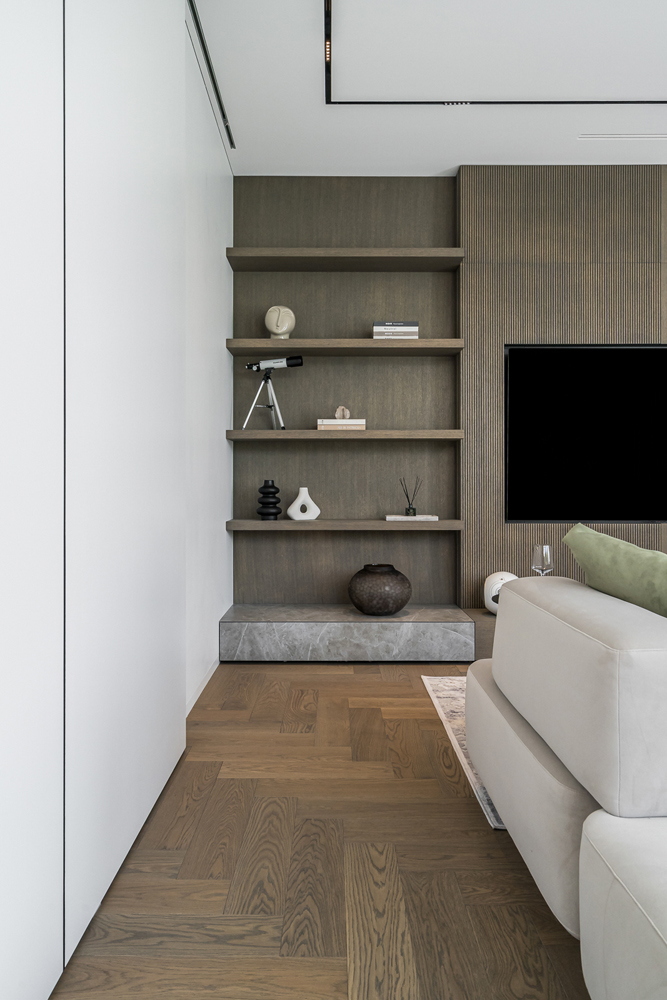 This interior project captures the balance between contemporary minimalism and subtle luxury. Natural materials – wood, stone, and glass – create a warm, harmonious atmosphere. Linear forms and hidden lighting emphasize architectural details and add refined modernity. Soft tones and textures expand the space, while dark metal accents and green furniture introduce character. Every element reflects a seamless blend of aesthetics and functionality, shaping a calm, elegant living environment.
