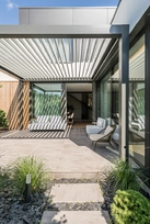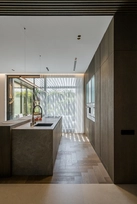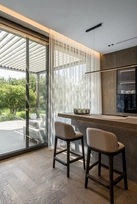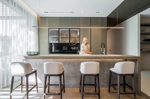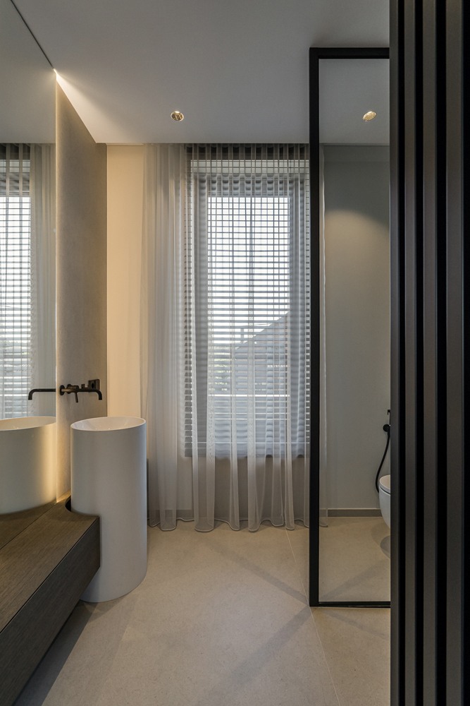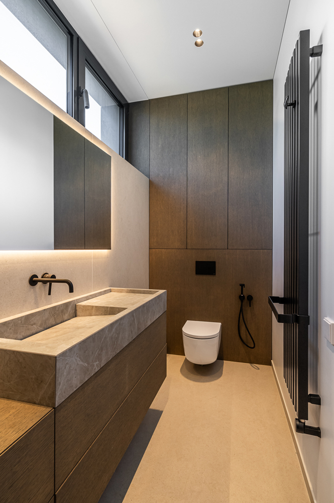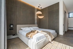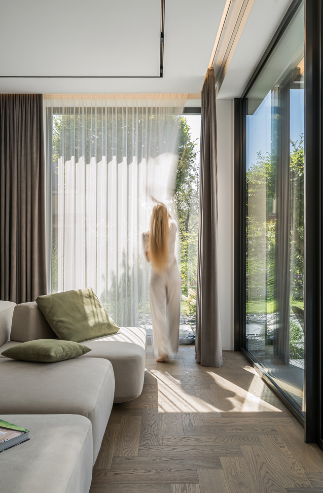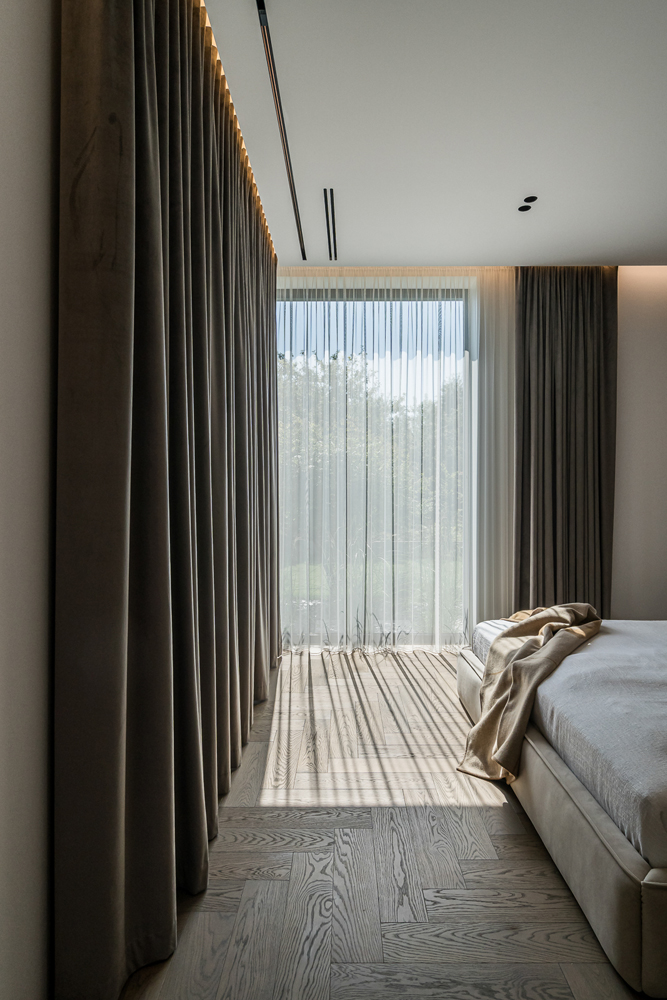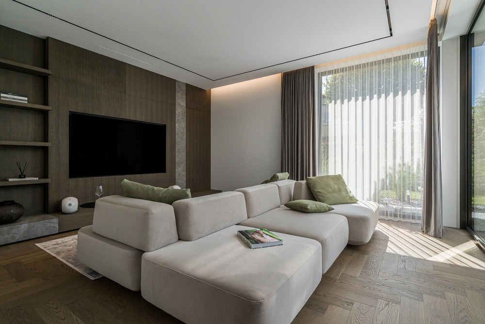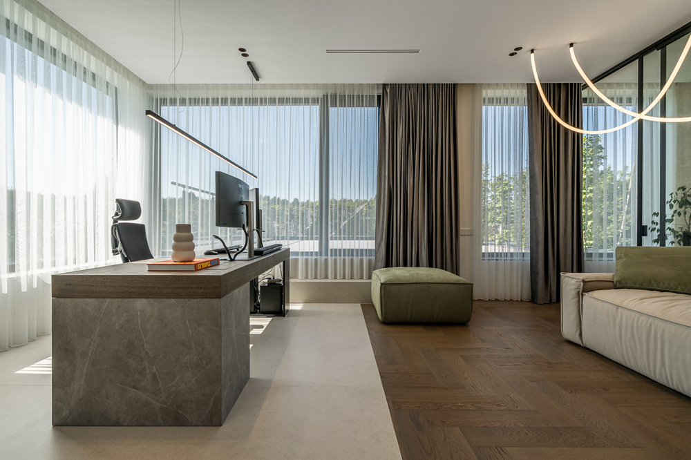 Šis interjero projektas įkūnija šiuolaikinio minimalizmo ir subtilios prabangos santykį. Dominuoja natūralios medžiagos – medis, akmuo ir stiklas, kurios kuria šiltą, harmoningą atmosferą. Linijinės formos ir paslėptas apšvietimas pabrėžia architektūrines detales, suteikdami erdvei išgryninto modernumo. Šviesūs atspalviai ir švelnios tekstūros vizualiai praplečia erdves, o akcentai – tamsaus metalo detalės ir sodrios žalios spalvos baldai – suteikia charakterio ir išskirtinumo. Interjere vyrauja aiški proporcijų pusiausvyra, švarios linijos ir kruopščiai apgalvoti apšvietimo scenarijai. Tai erdvė, kurioje estetika dera su funkcionalumu, o kiekviena detalė kuria išskirtinį gyvenimo ritmą.