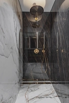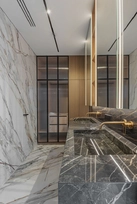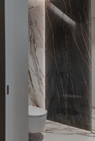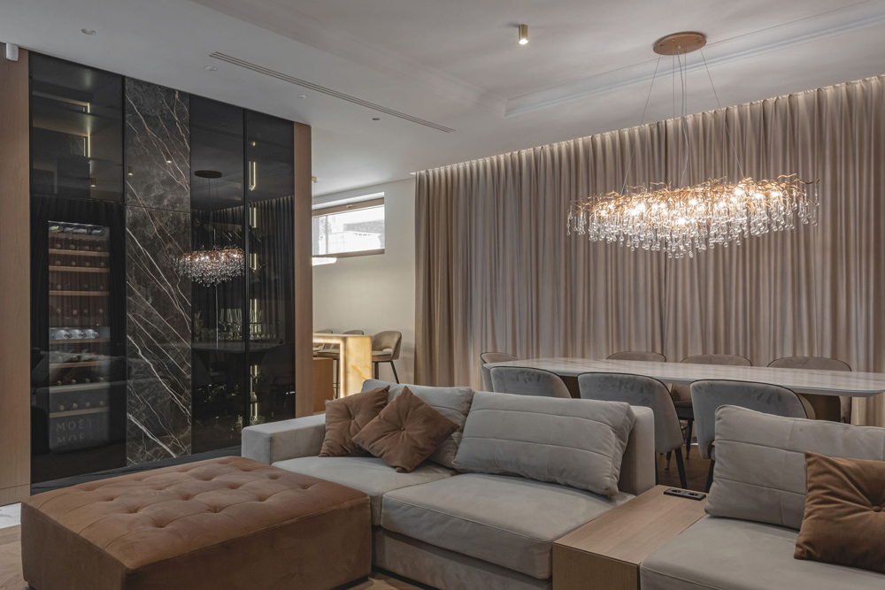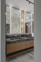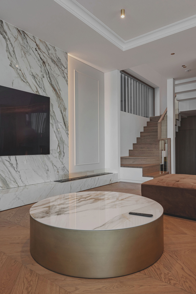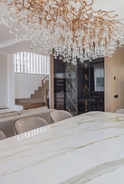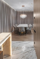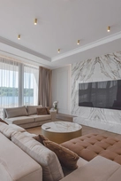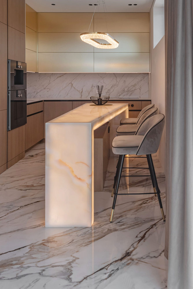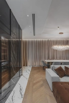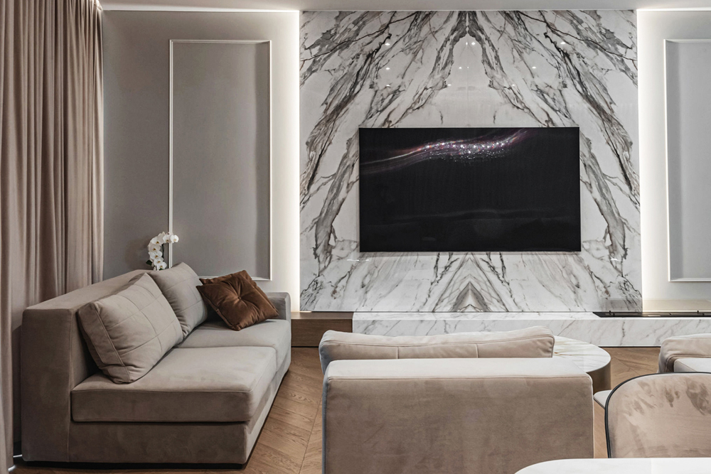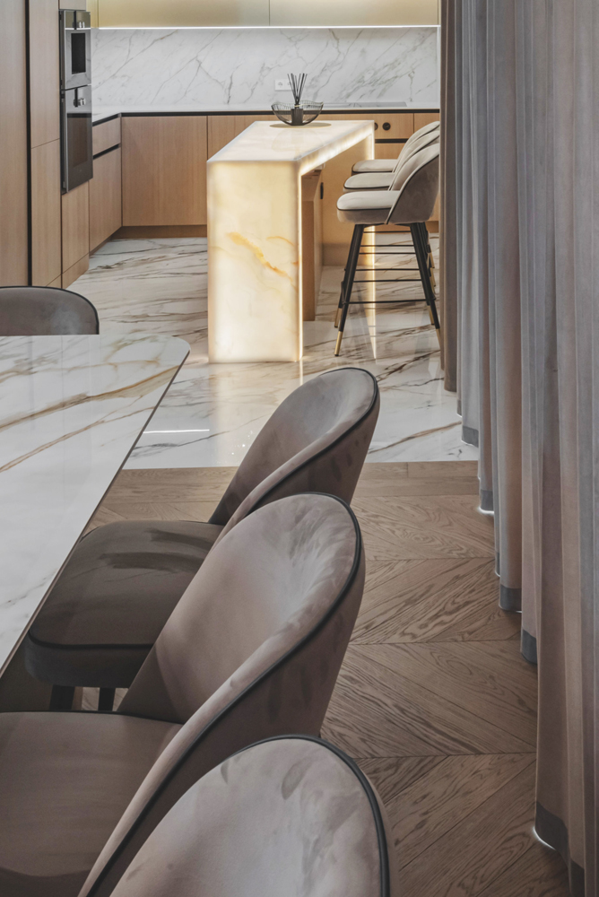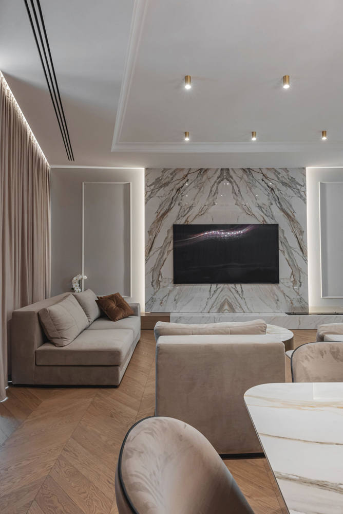 This interior project blends modern luxury with refined elegance. Natural stone, soft textiles, and subtle gold accents create a warm yet sophisticated atmosphere. Light tones and expansive marble surfaces—from feature walls to countertops—add visual unity and a sense of exclusivity. Plush furniture, earthy hues, and sculptural lighting balance comfort with style, while concealed lighting highlights architectural lines and adds depth. The result is a harmonious, polished interior where every detail contributes to a welcoming and distinguished ambiance.