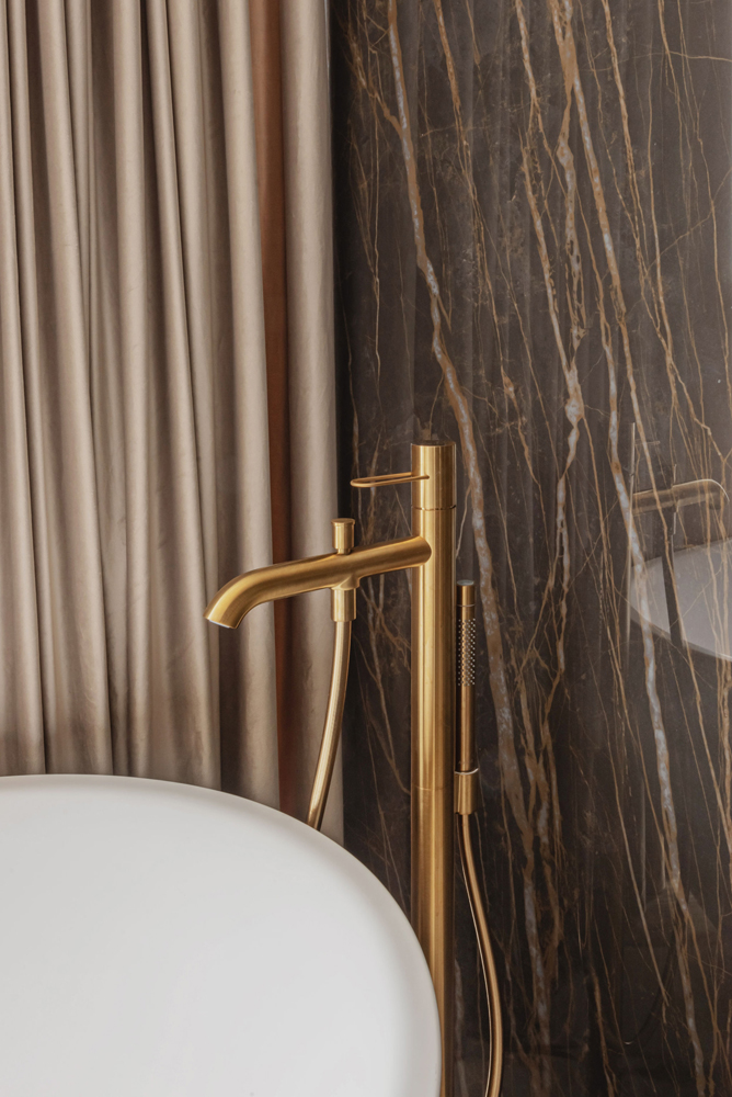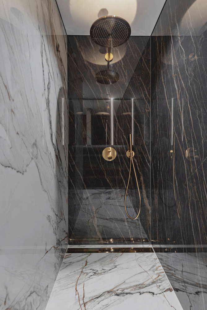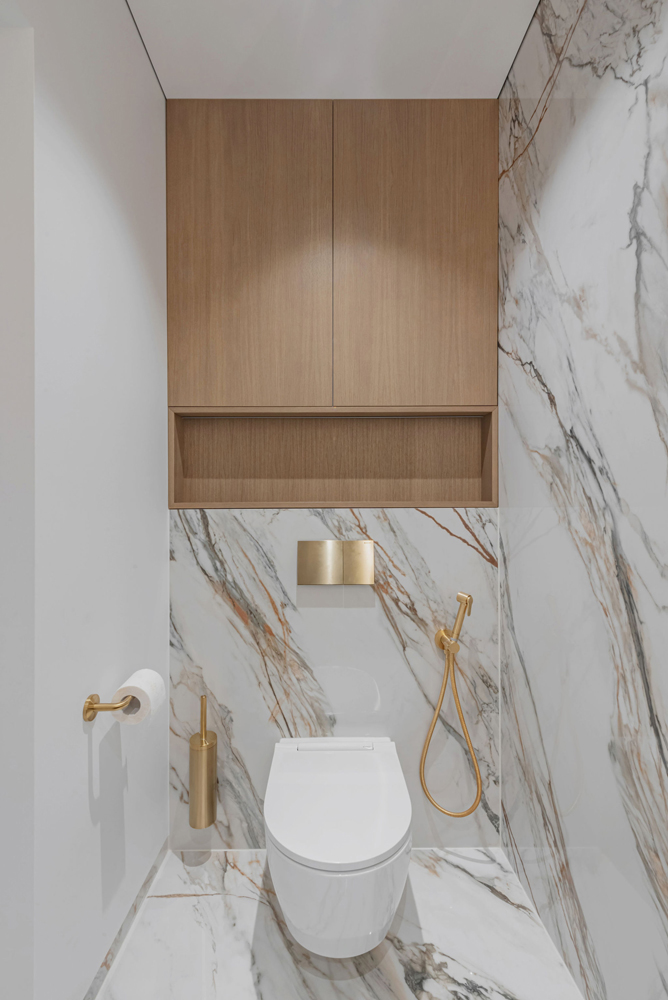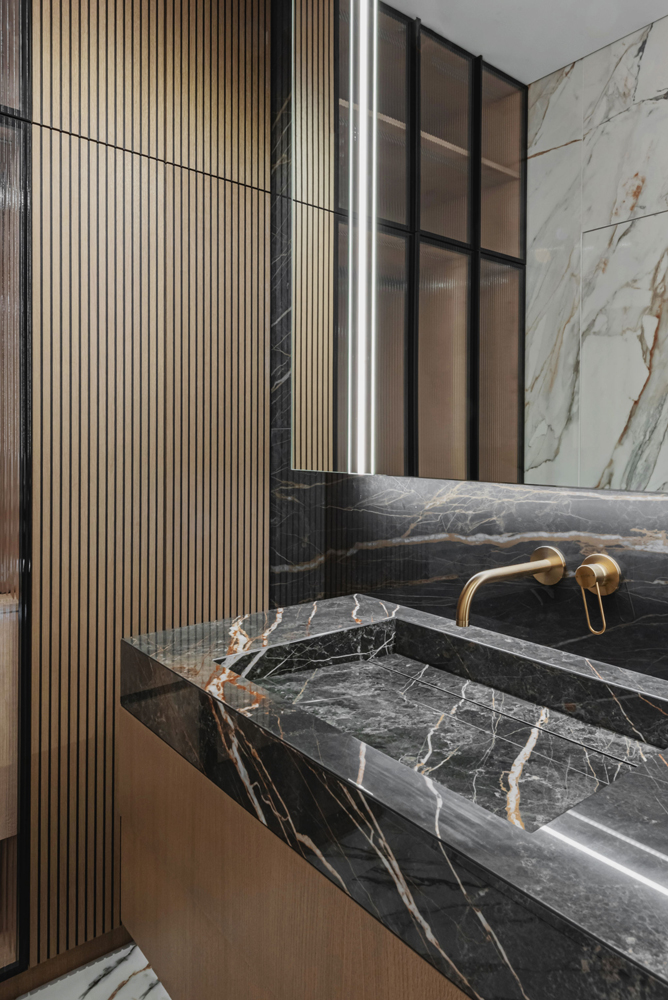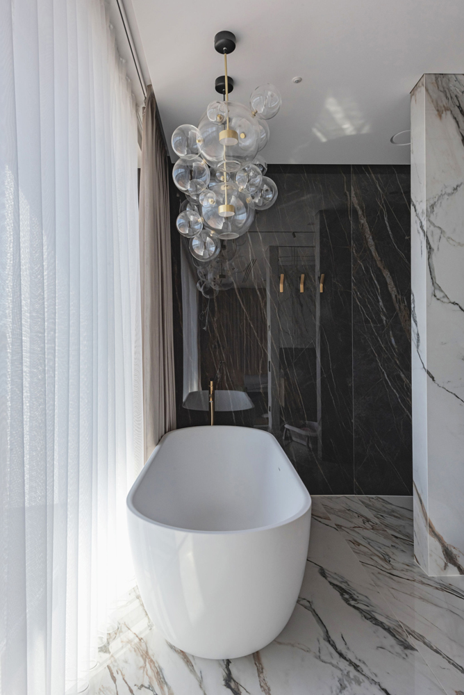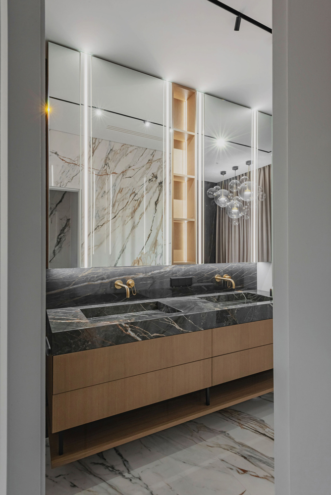 Šis interjero projektas – tai modernios prabangos ir elegantiškos estetikos derinys, kuriame ryškiausią įspūdį kuria natūralus akmuo, švelnios tekstilės ir subtilūs aukso akcentai. Erdvėse dominuoja šviesūs atspalviai, suteikiantys lengvumo ir jaukumo, o dideli marmuro paviršiai – nuo sienų iki stalviršių – kuria vizualinį vientisumą ir išskirtinumo pojūtį. Minkšti baldai, žemės tonų paletė ir elegantiški šviestuvai subalansuoja prabangą su komfortu. Paslėptas apšvietimas išryškina architektūrines linijas ir suteikia erdvėms gylio. Šis interjeras harmoningas, rafinuotas, kuriame kiekviena detalė papildo bendrą estetiką ir kuria išskirtinai jaukią, reprezentatyvią atmosferą.