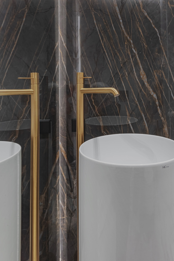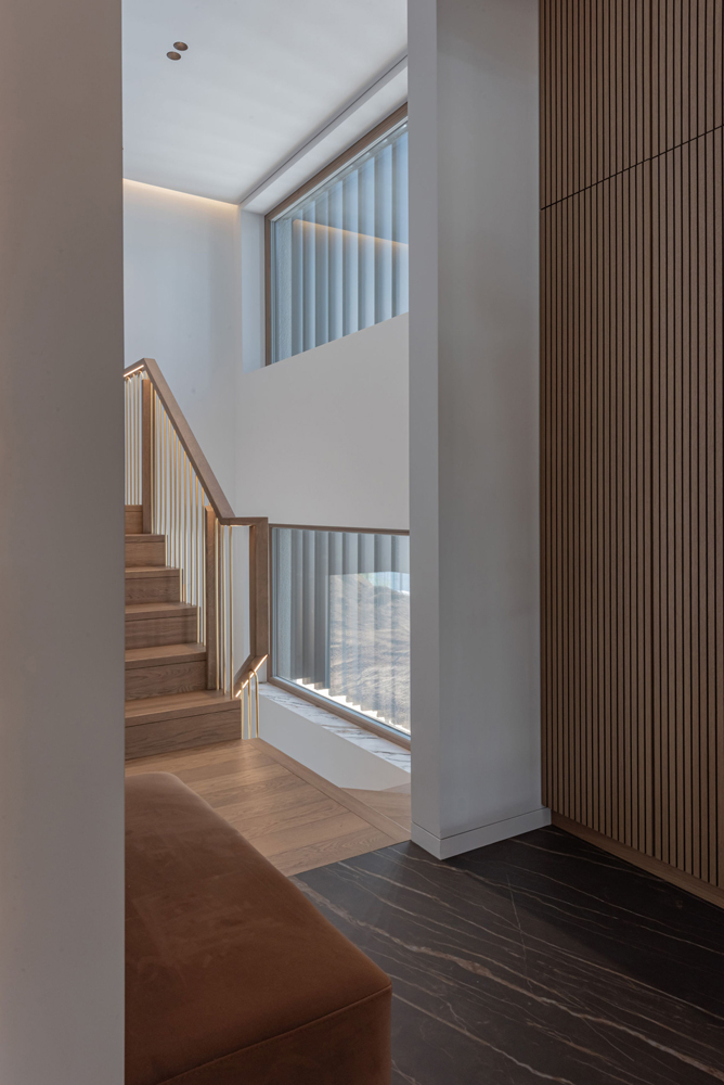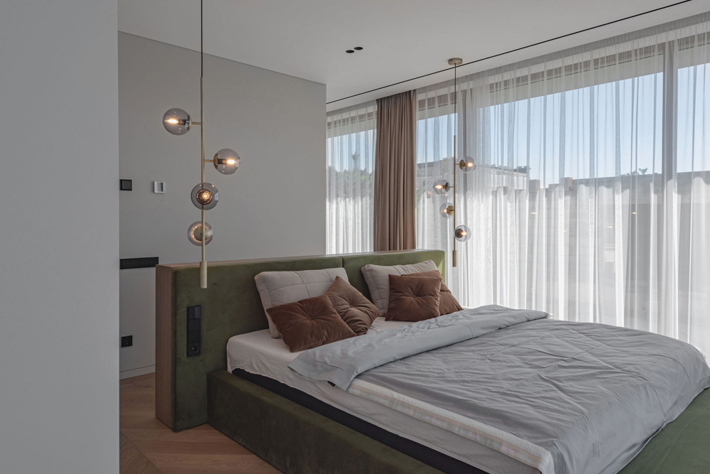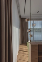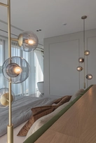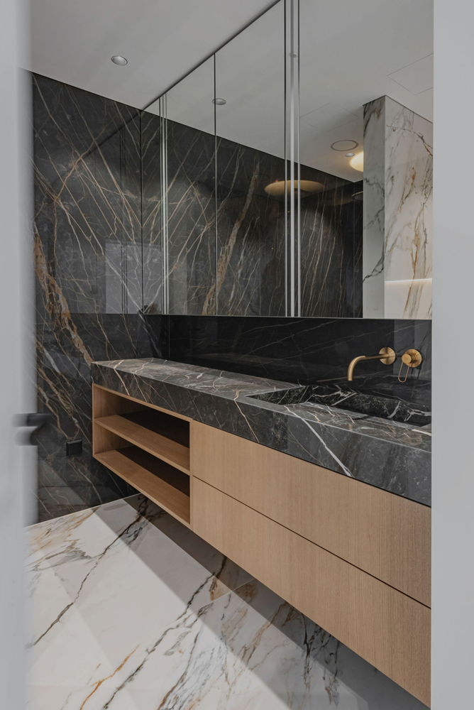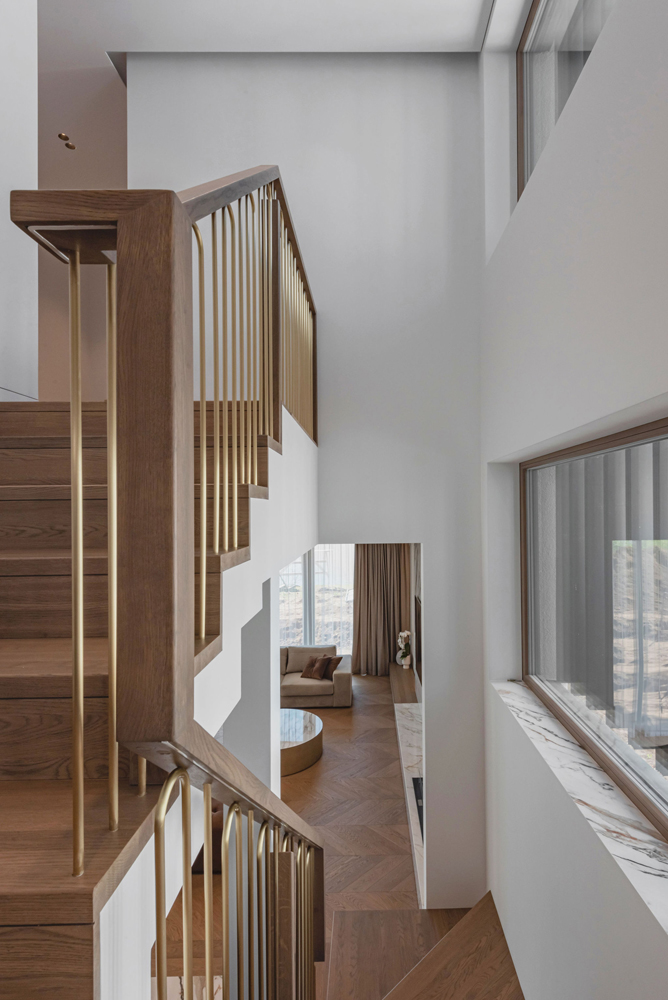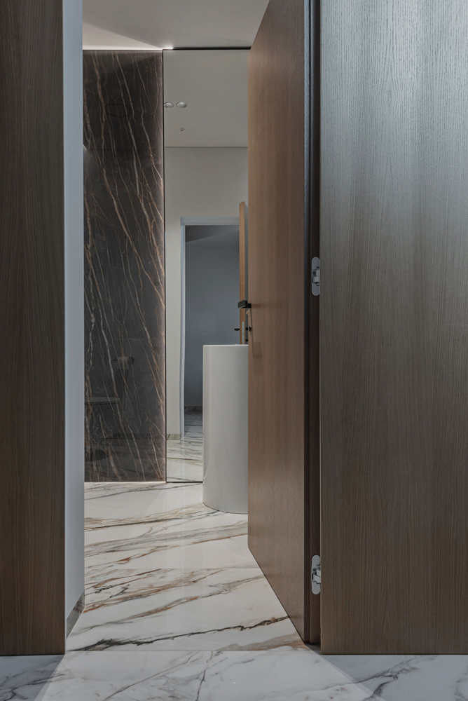 Šis interjero projektas – tai modernios prabangos ir elegantiškos estetikos derinys, kuriame ryškiausią įspūdį kuria natūralus akmuo, švelnios tekstilės ir subtilūs aukso akcentai. Erdvėse dominuoja šviesūs atspalviai, suteikiantys lengvumo ir jaukumo, o dideli marmuro paviršiai – nuo sienų iki stalviršių – kuria vizualinį vientisumą ir išskirtinumo pojūtį. Minkšti baldai, žemės tonų paletė ir elegantiški šviestuvai subalansuoja prabangą su komfortu. Paslėptas apšvietimas išryškina architektūrines linijas ir suteikia erdvėms gylio. Šis interjeras harmoningas, rafinuotas, kuriame kiekviena detalė papildo bendrą estetiką ir kuria išskirtinai jaukią, reprezentatyvią atmosferą.