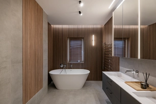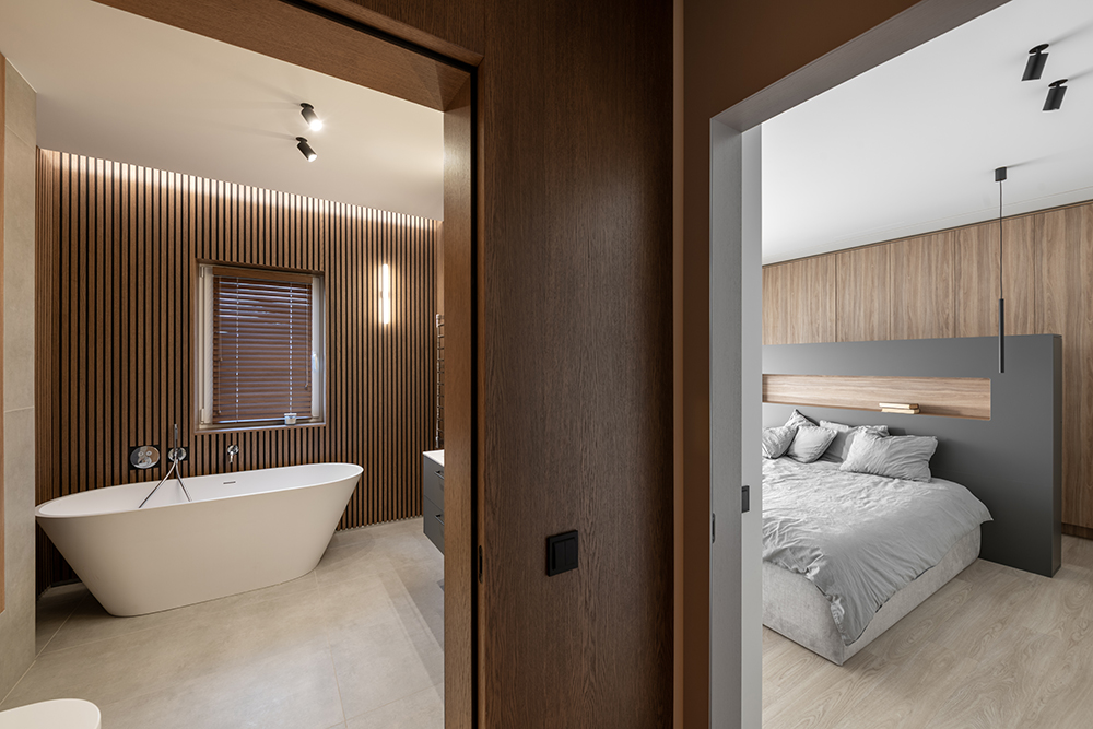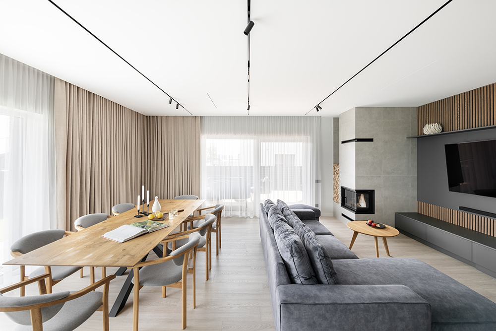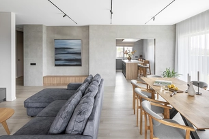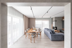 This interior design project in Kaunas began at a very early stage – when the building's walls were just going up. The layout of several areas in the house was modified to open up the spaces, simplify solutions, and create a more unified image. Such early involvement allowed us to make architectural decisions and change the layout of some spaces. The unnecessary partitions were eliminated, the functionality of the rooms was refined, and an open, visually unified concept was pursued.