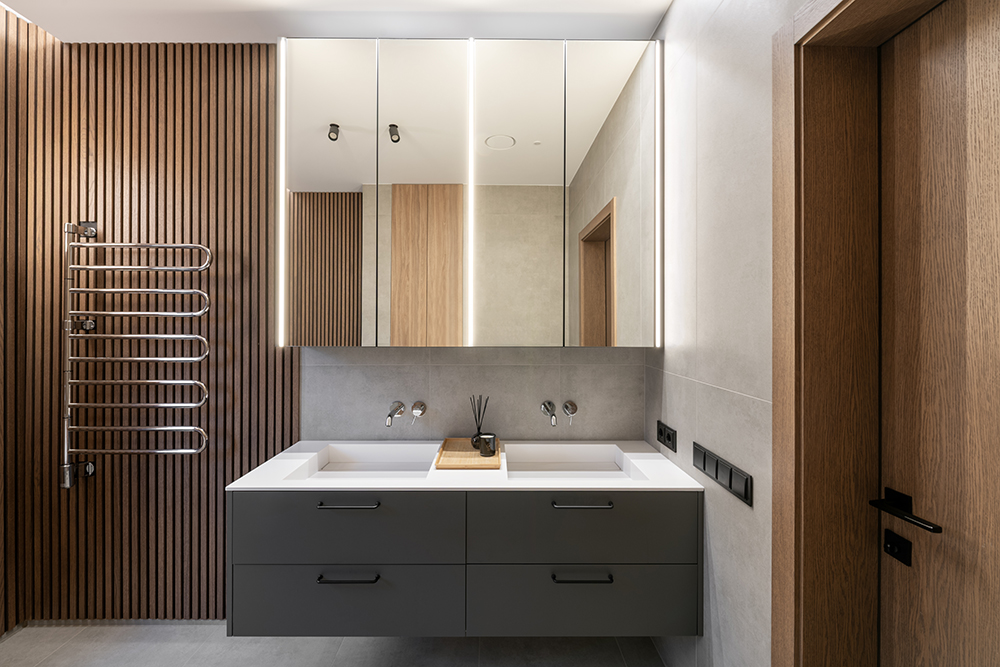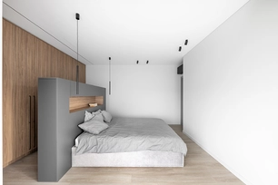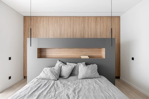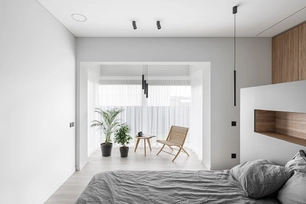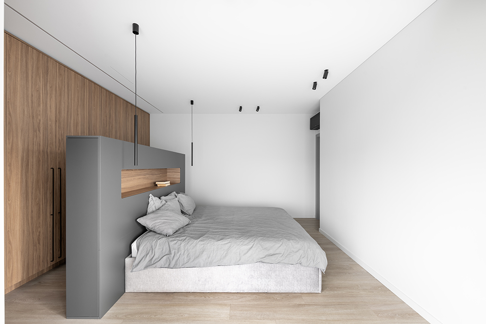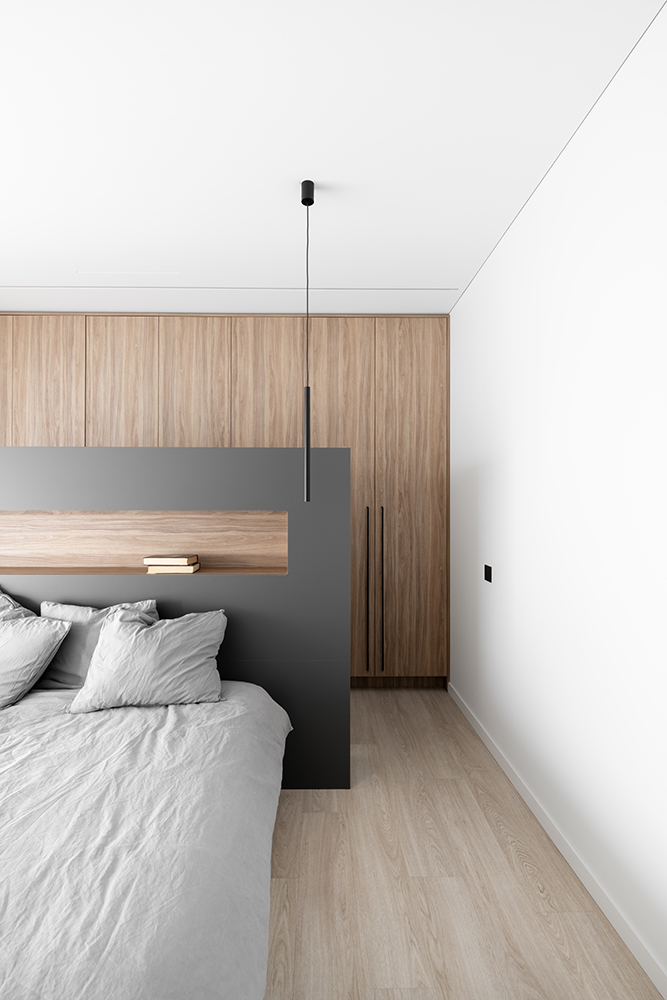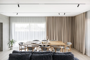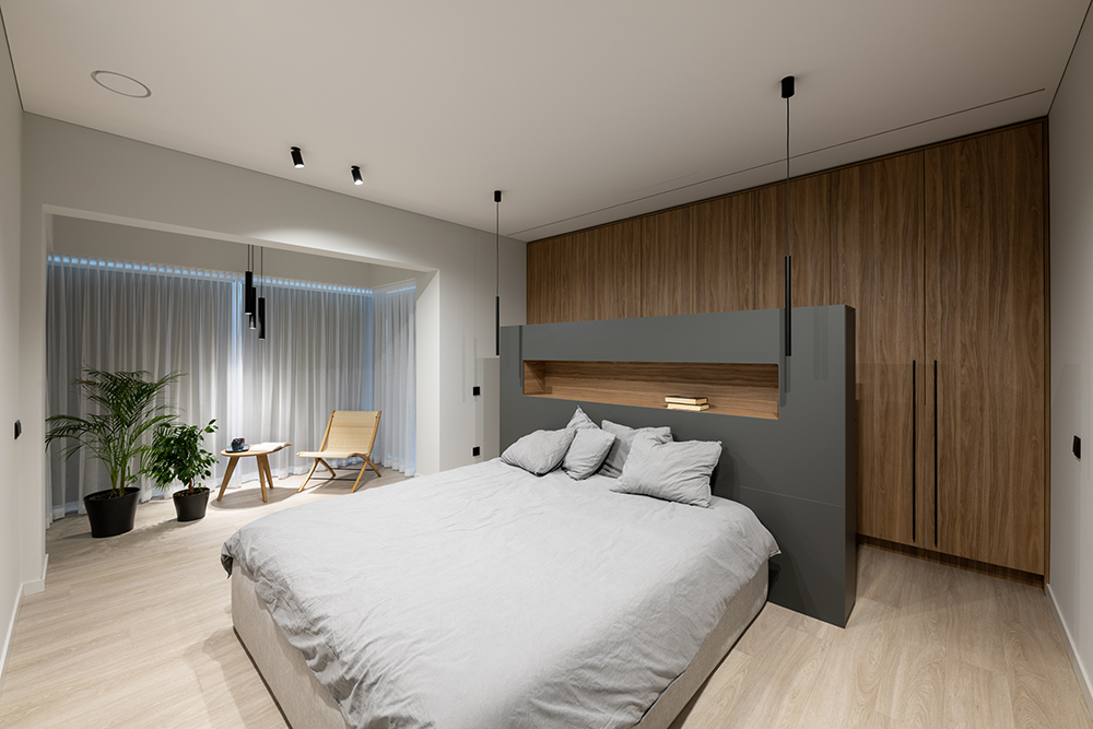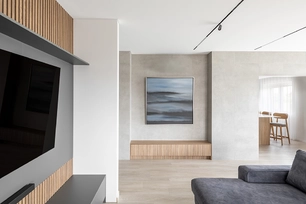 The ceiling height was also increased by 20 centimeters to enhance the sense of spaciousness. All lighting fixtures were designed to be minimalist, with many recessed lights emphasizing the room's architecture. A large, laconic rectangular light fixture is planned to be placed above the kitchen island, mirroring the size of the island – the light plane ensures both functionality and aesthetics.