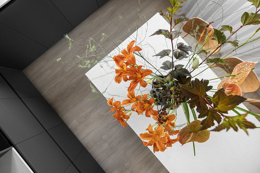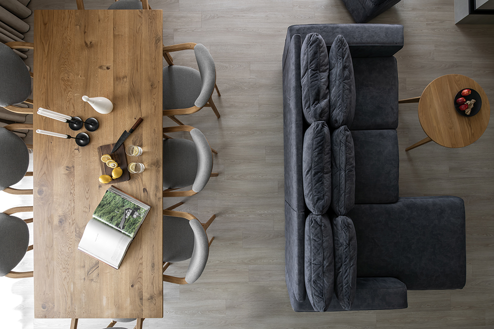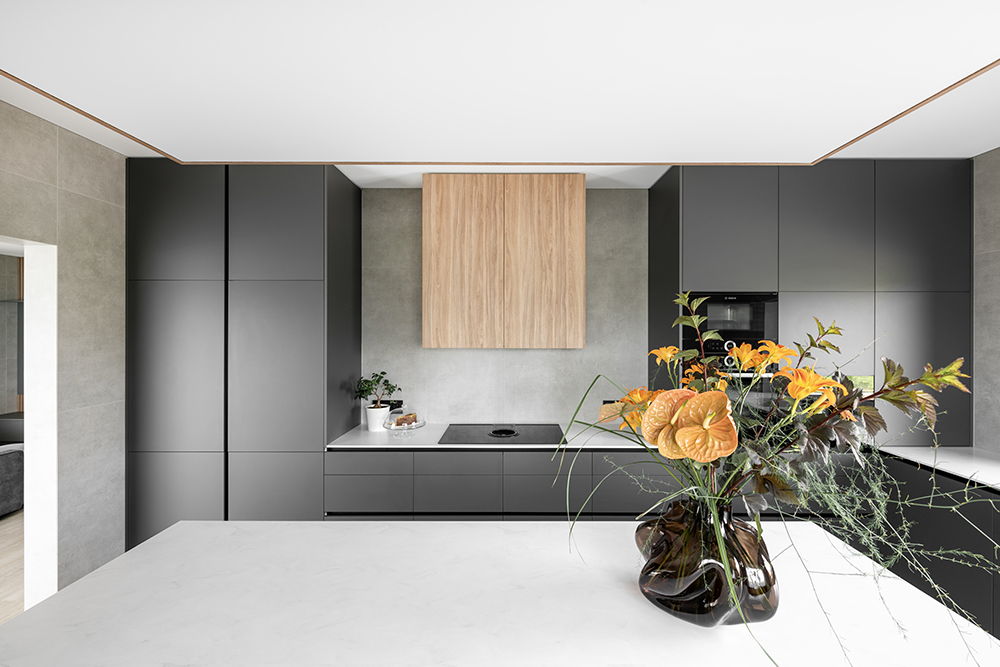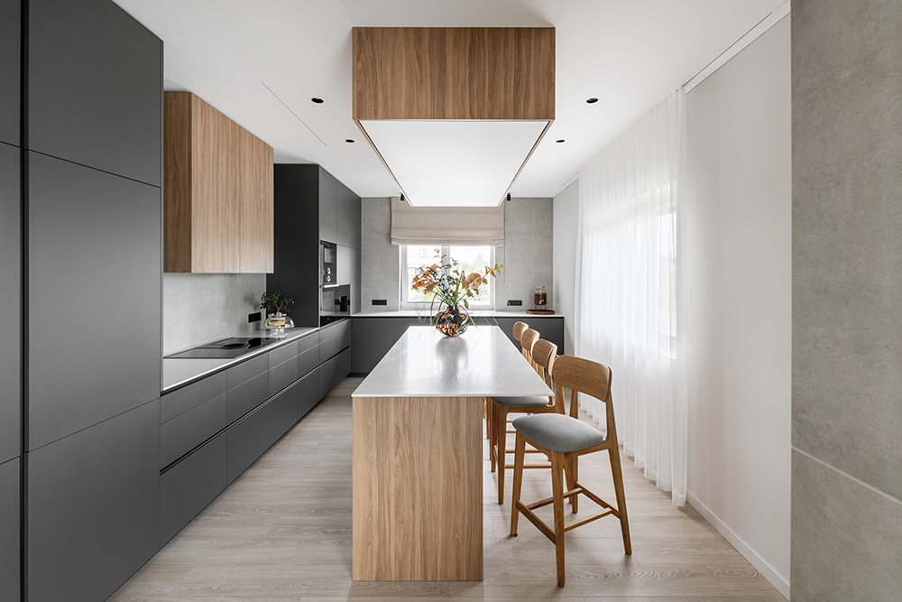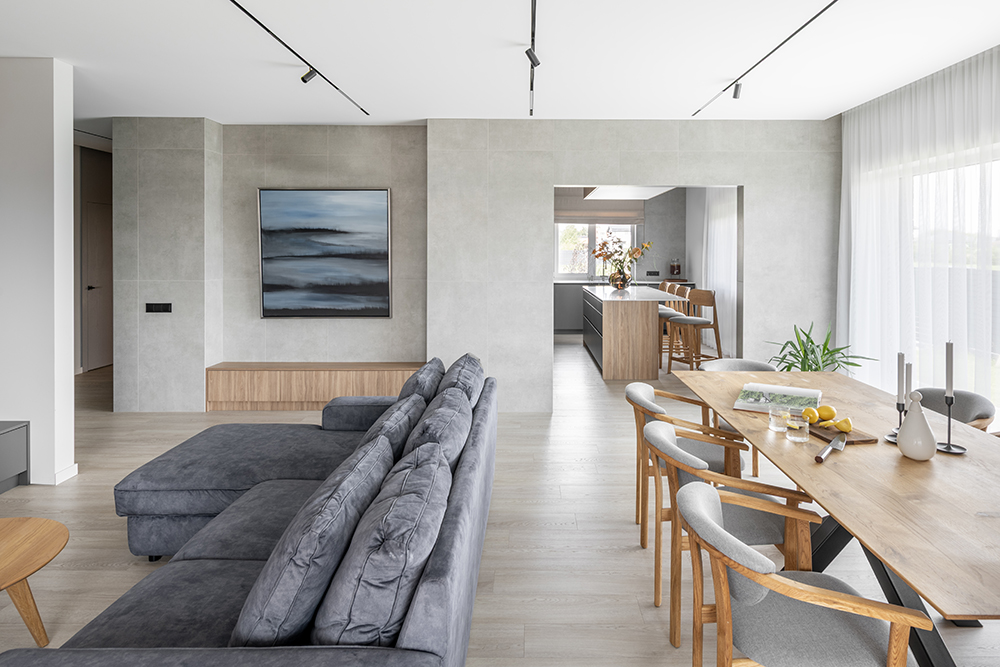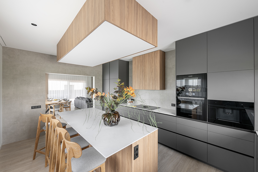 One of the most important changes within the layout was merging the kitchen and the living room. The impressively large 2.4-meter-long kitchen island became not only a functional solution but also a strong visual accent for the entire home.