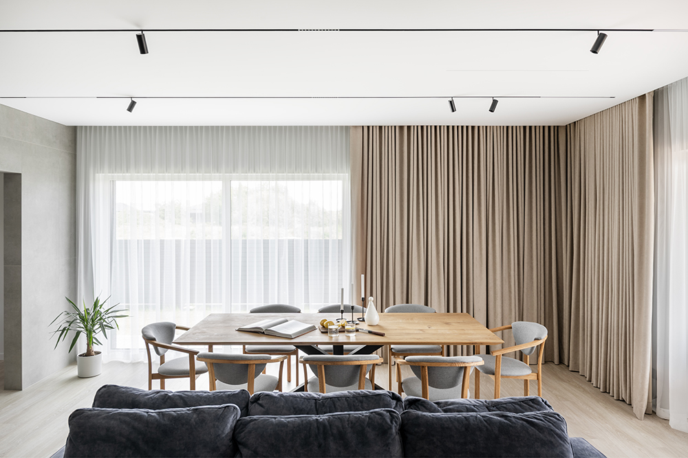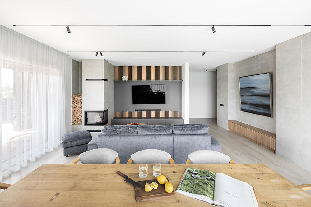 Šio interjero projektas Kaune prasidėjo dar labai ankstyvoje stadijoje – kai pastato sienos dar tik kilo. Name pakeista keleto erdvių išplanavimas norint atverti erdves, supaprasti sprendimus ir sukurti vientisesnį vaizdą. Toks ankstyvas įsitraukimas leido prisidėti prie architektūrinių sprendimų ir keisti kai kurių erdvių išplanavimą: buvo atsisakyta perteklinių pertvarų, išgrynintas erdvių funkcionalumas bei siekta sukurti atvirą, vizualiai vientisą koncepciją.