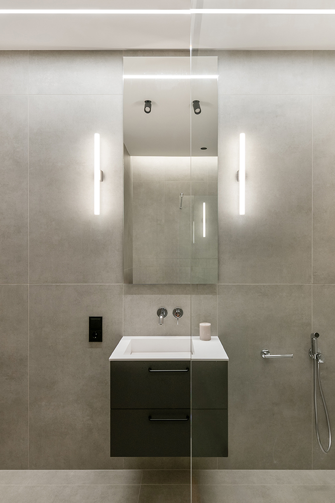 Nuo pradinės architektūrinės koncepcijos buvo pakoreguotas ir lubų aukštis – padidintas 20 centimetrų, taip sustiprinant erdvių pojūtį. Visi šviestuvai projektuoti minimalistiški, daug įleidžiamų siekiant pabrėžti patalpų architektūrą. Virš virtuvės salos numatytas didelis, lakoniškas stačiakampio formos šviestuvas, atkartojantis salos dydį – šviesos plokštuma užtikrina tiek funkcionalumą, tiek estetiką.