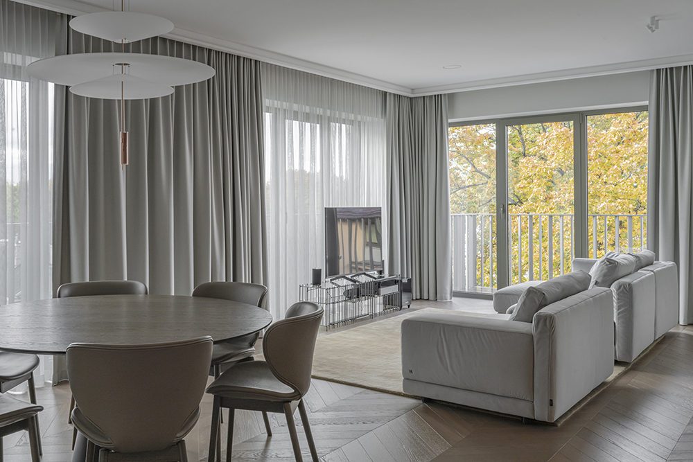 Nors baldinių sprendimų kiekis nemažas, baldai netampa dominante ir išsaugomas erdvumo pojūtis.