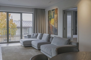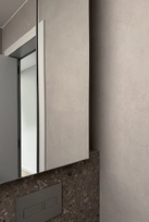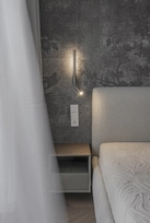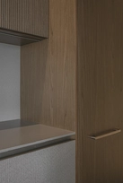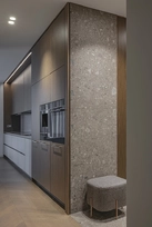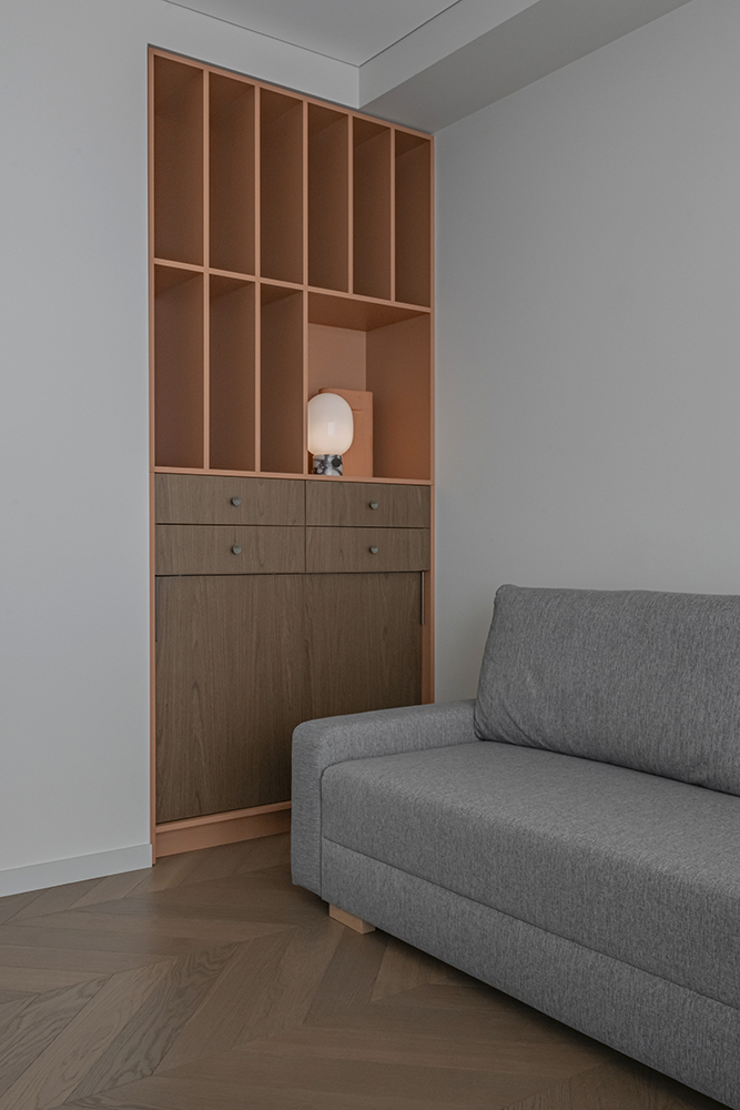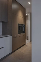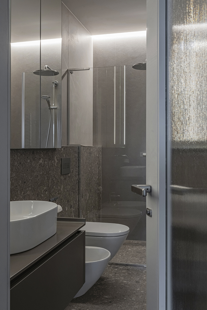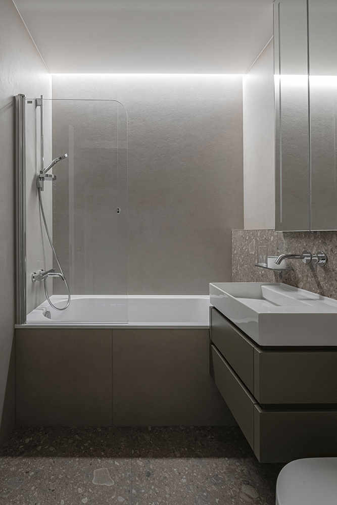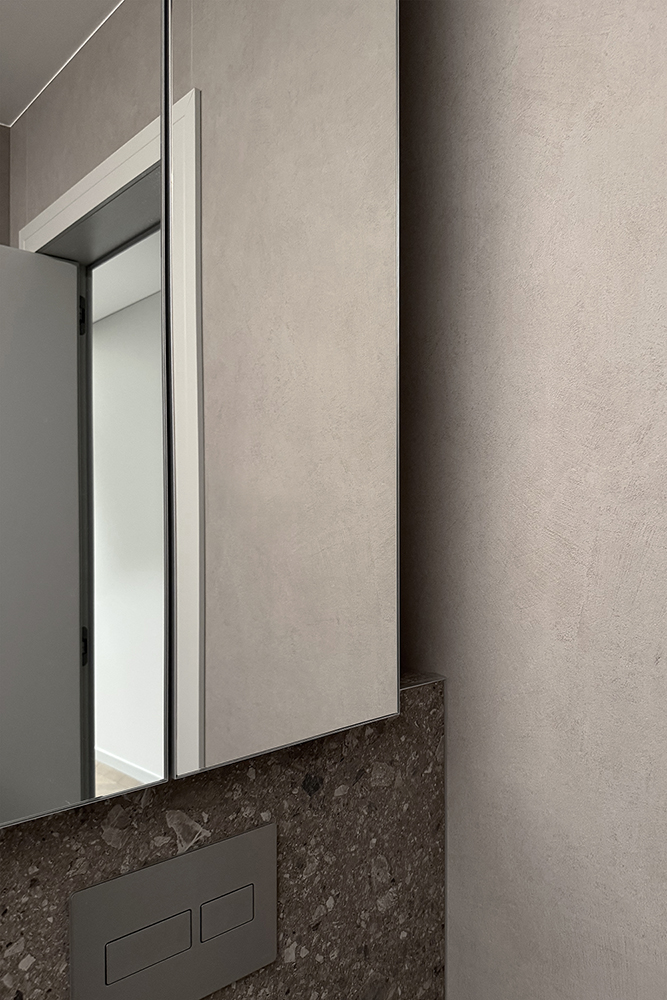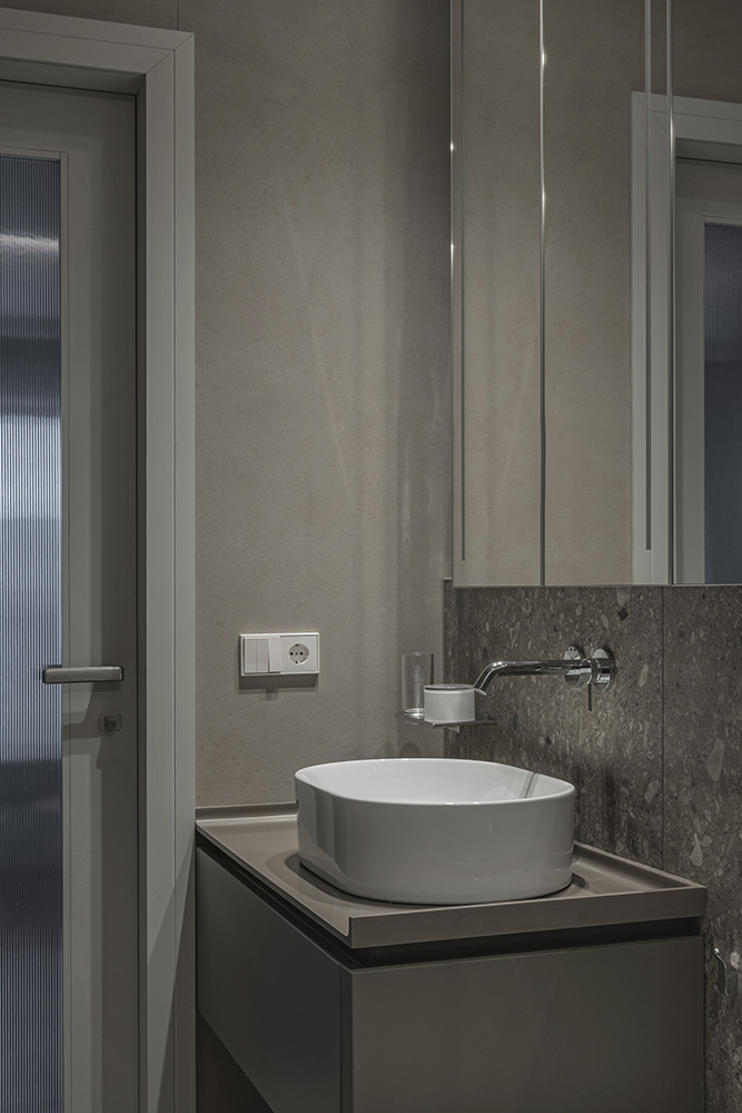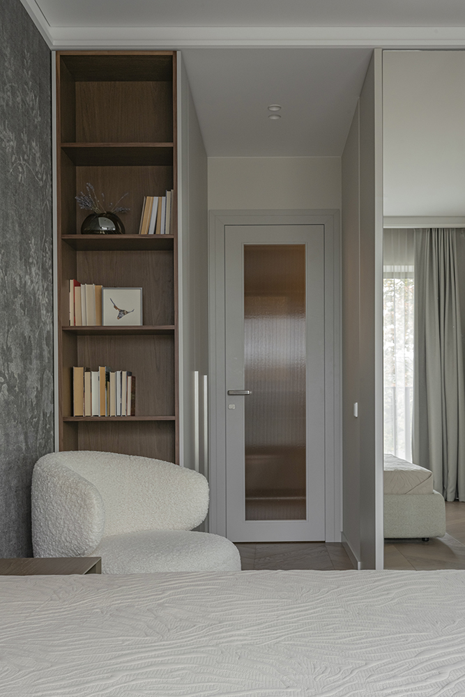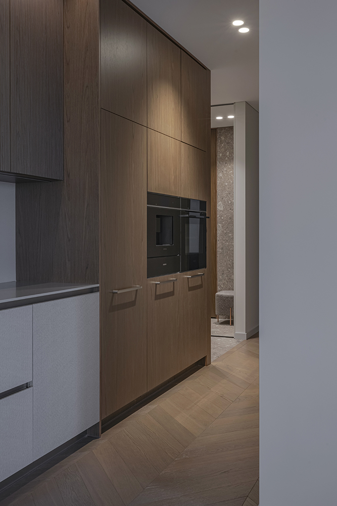 At the same time, the functional layout plays a significant role. For seamless everyday living, a dedicated utility room for laundry/clothes care has been designed, while integrated furniture is masterfully buit into transit zones, making meaningfull use of corridor spaces.