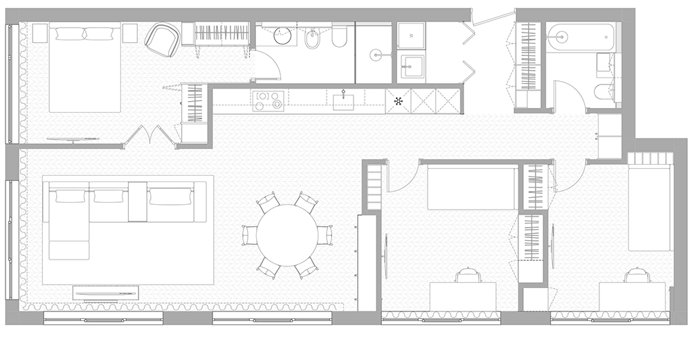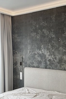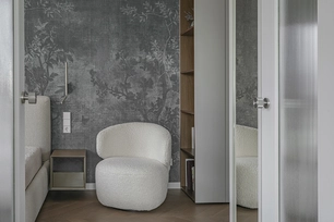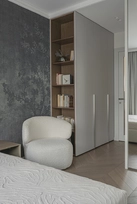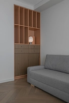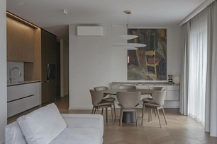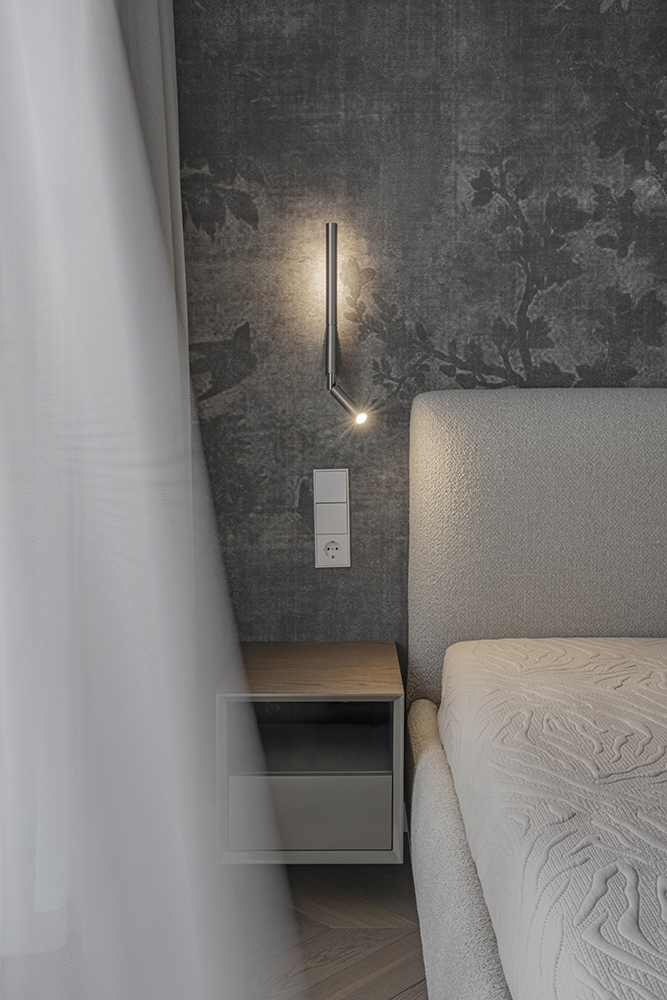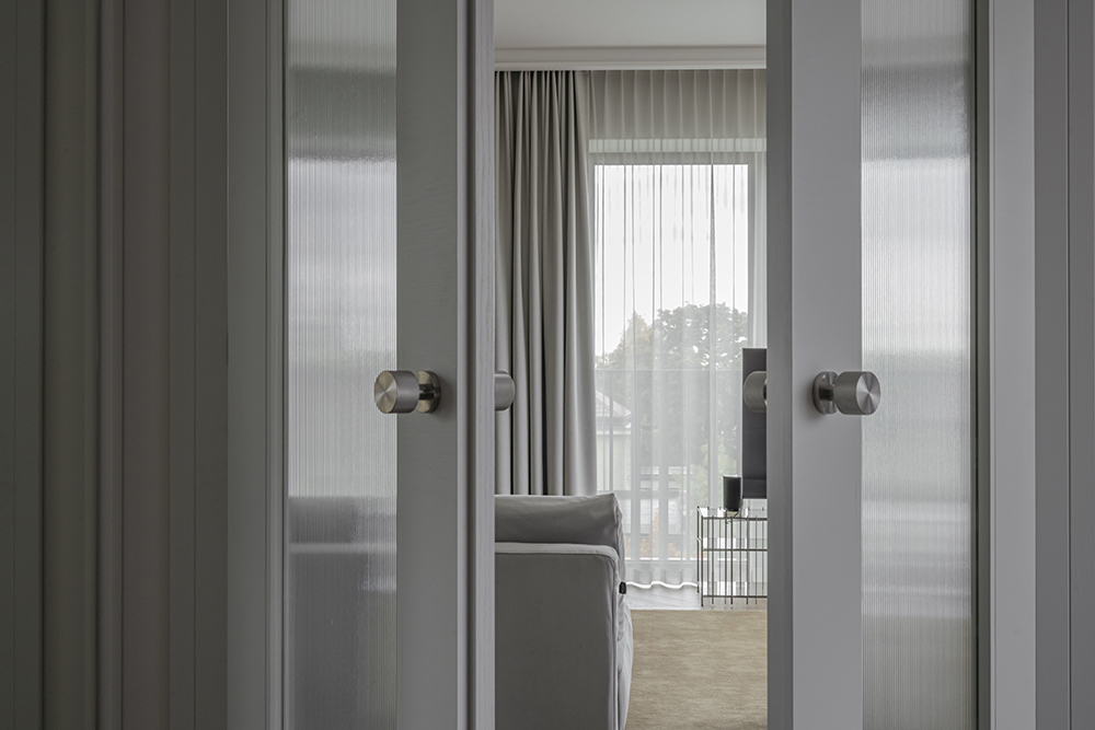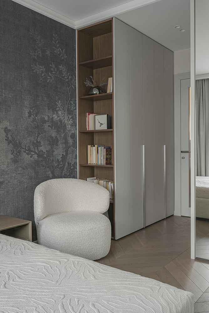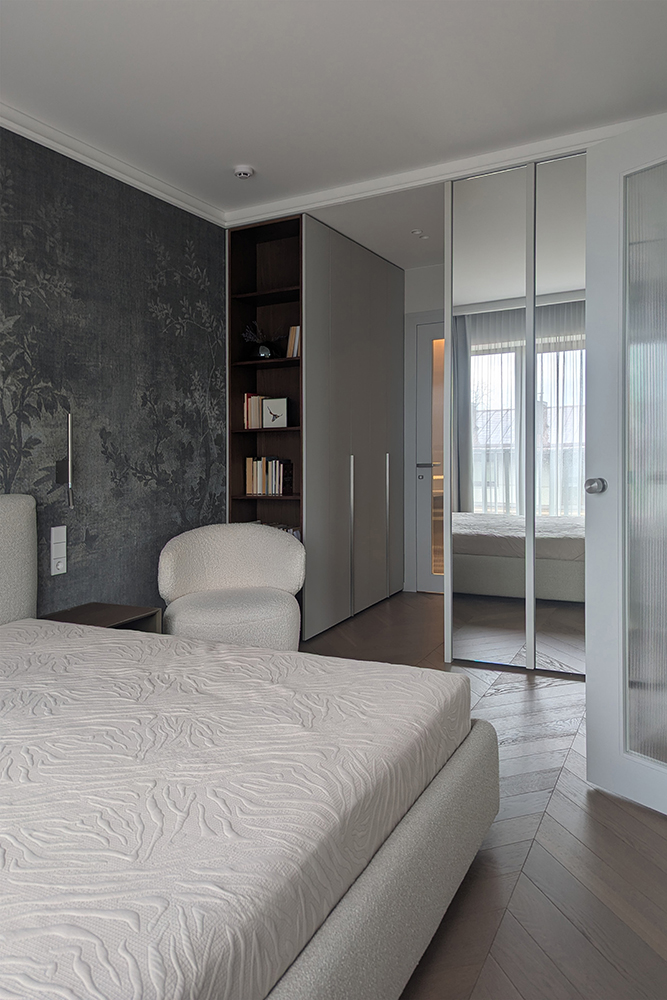 This project is characterized by a harmonious blend of timeless classic details and solutions that do not overload the space. The interior is moderately ornate, where the aesthetic weight is created by the chevron patterned floor, cornices, double doors with textured glass, mirror reflections, and decorative wallpaper in the bedroom.