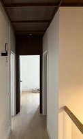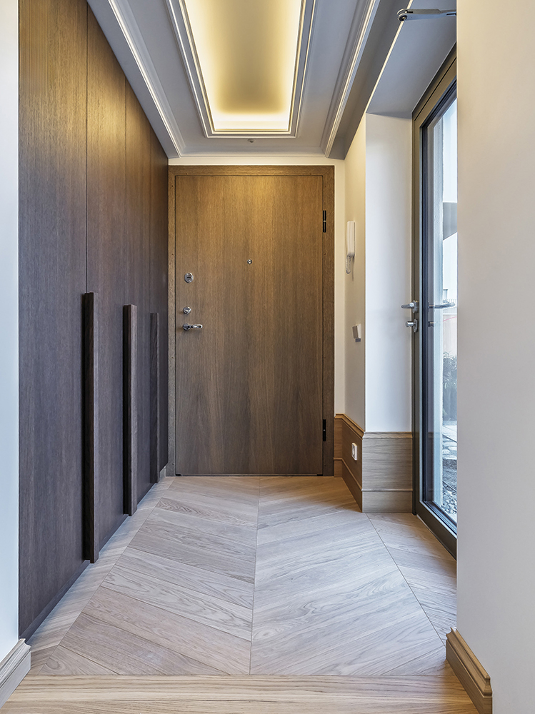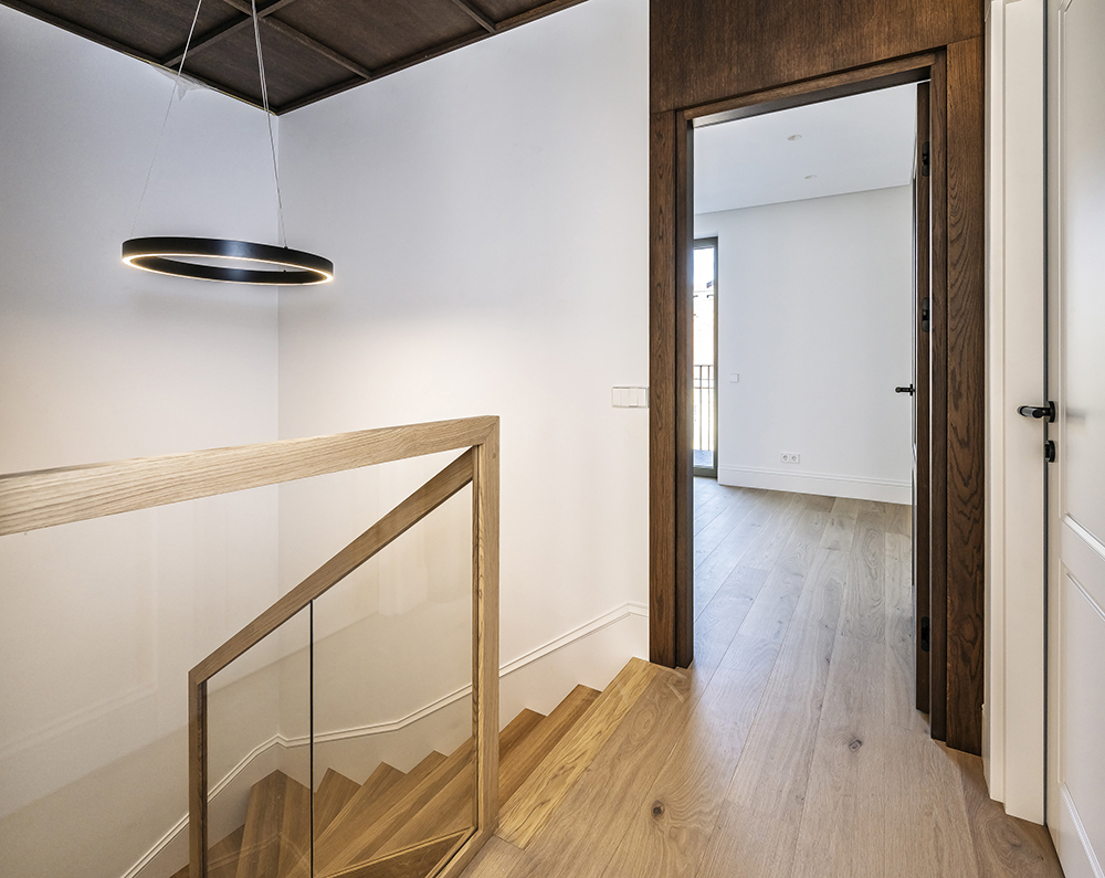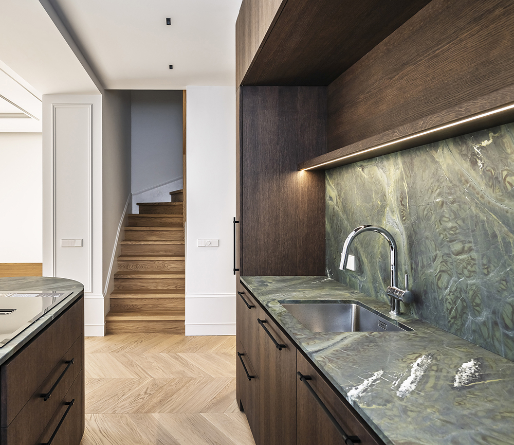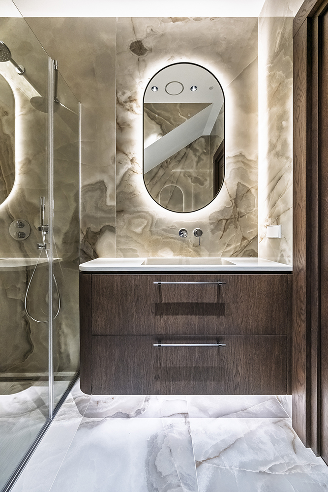 Special attention was given to the lighting design — it was planned to remain visually subtle while providing a warm and comfortable level of illumination. Near the exit to the outdoors, a backlit onyx stone element was integrated, adding both a functional and a cozy accent. On the second floor, the main feature is the dark wood ceiling, which visually lowers the space and clearly signals the transition into the private bedroom area.