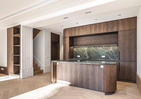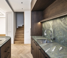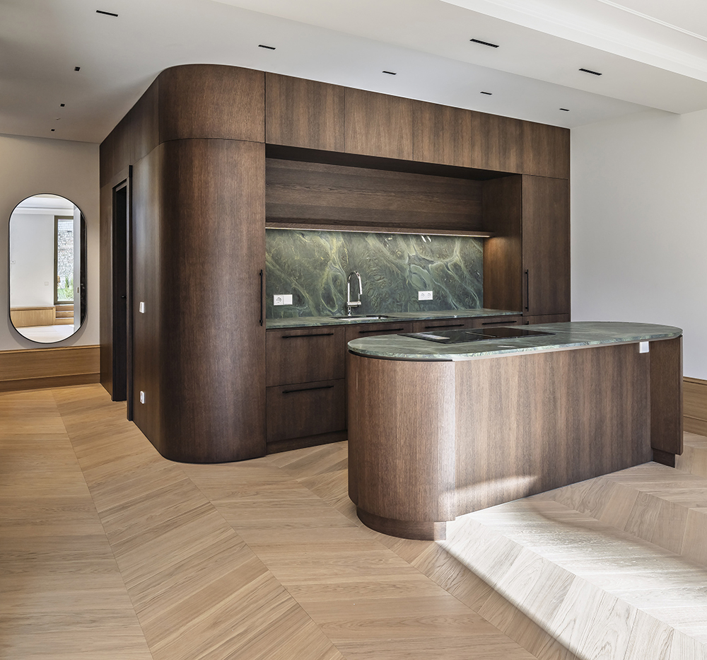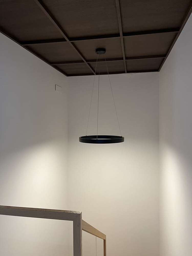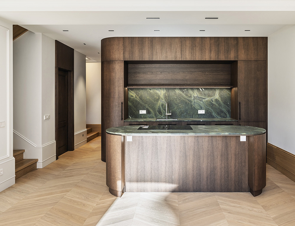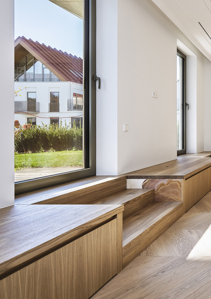 Special attention was given to the lighting design — it was planned to remain visually subtle while providing a warm and comfortable level of illumination. Near the exit to the outdoors, a backlit onyx stone element was integrated, adding both a functional and a cozy accent. On the second floor, the main feature is the dark wood ceiling, which visually lowers the space and clearly signals the transition into the private bedroom area.