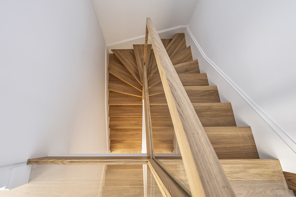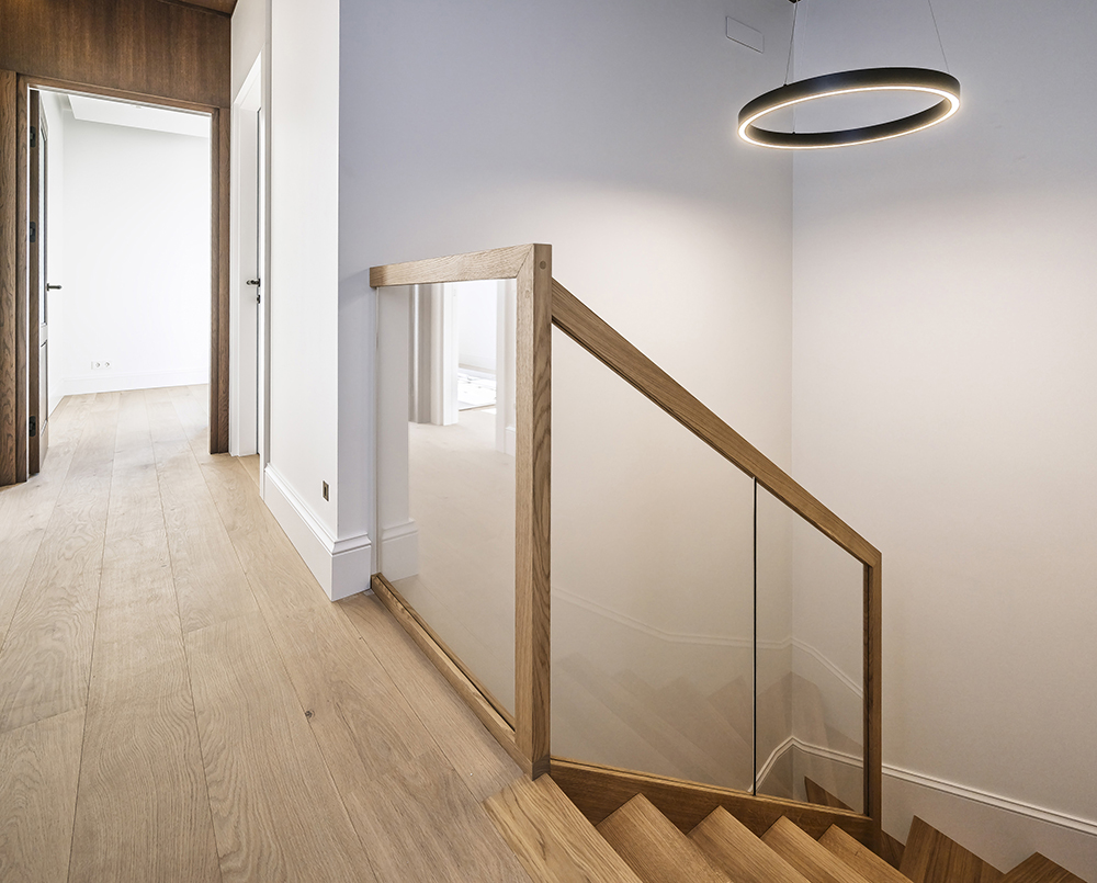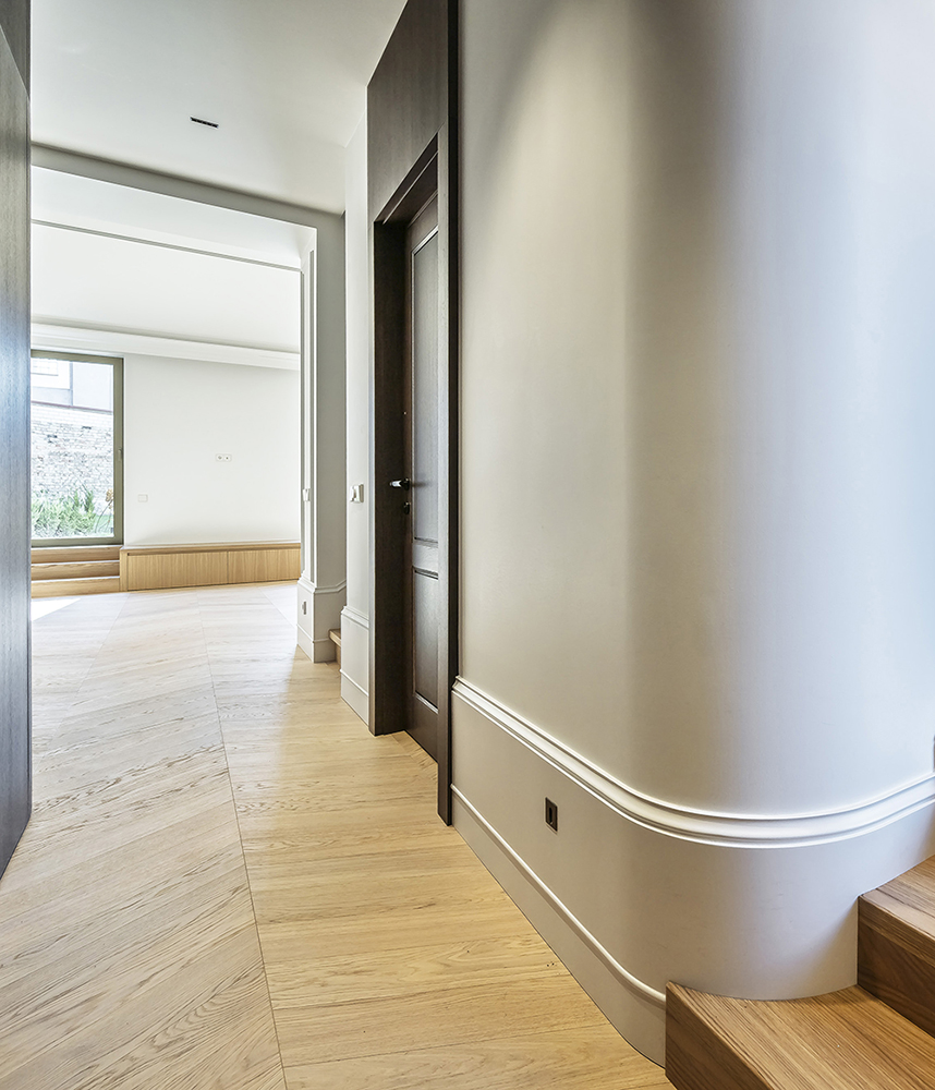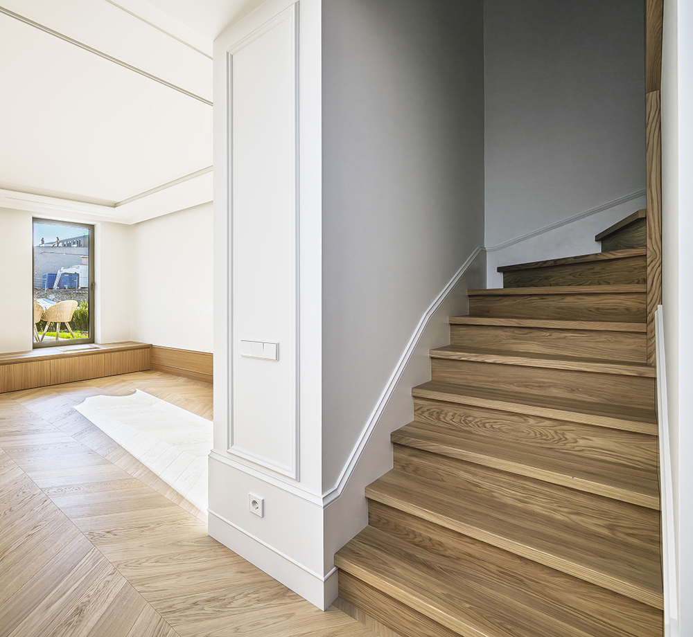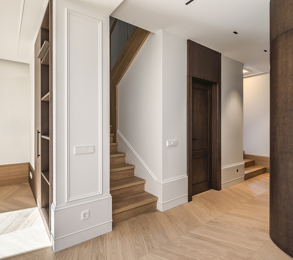 With this interior project, we aimed to create a classic Scandinavian home atmosphere. Natural wood was widely used throughout the interior, combining different shades, textures, and applications. On the ground floor, the entire perimeter is framed with 40 cm high decorative elements that reference traditional wall detailing. We were not afraid to mix different tones and junctions.