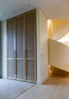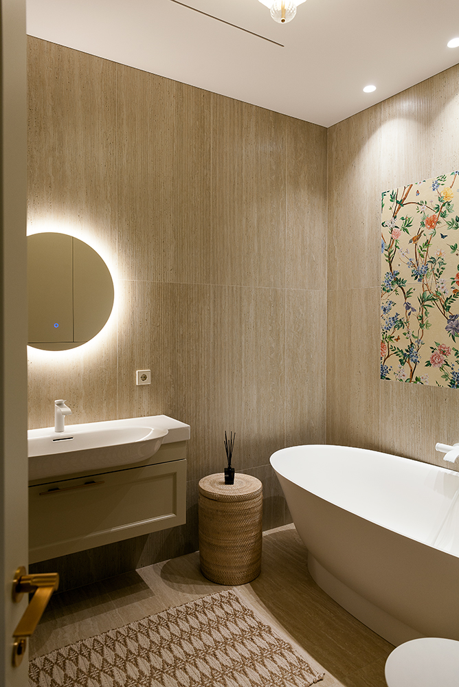 The living room features an impressive 7-metre-high ceiling. The dome is decorated with Italian clay, aiming to create the impression of cascading sand — an idea that was successfully realised. This motif is repeated in the bathrooms and the pre-sauna area, where travertine tiles are used instead. Large windows were installed throughout the villa, allowing abundant natural light to flood the interiors.