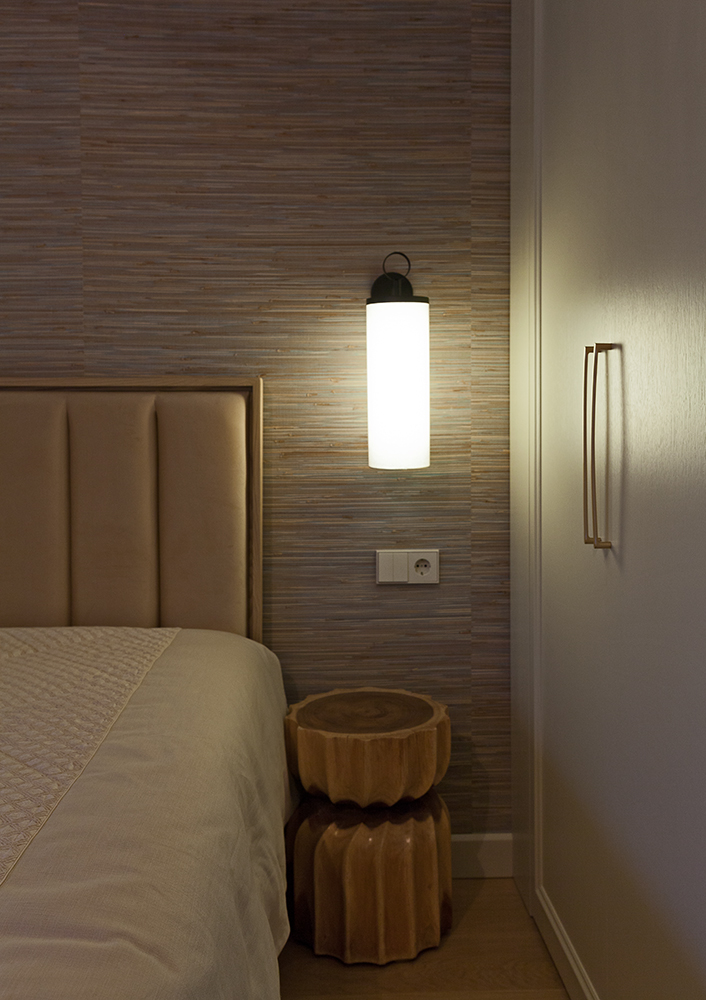 For artificial lighting, I used LED lighting, Murano glass lamps, as well as fixtures made from straw and dried banana peels. Natural materials dominate the interior: straw wallpaper, linen curtains and bedspreads, a custom-woven wool rug created specifically for the home office, and wooden floors and furniture.