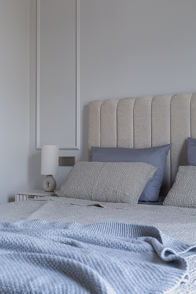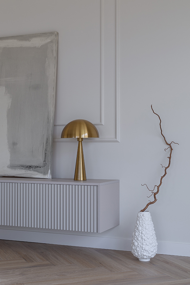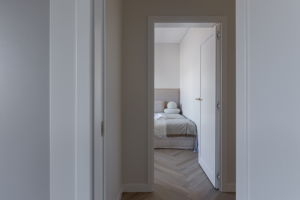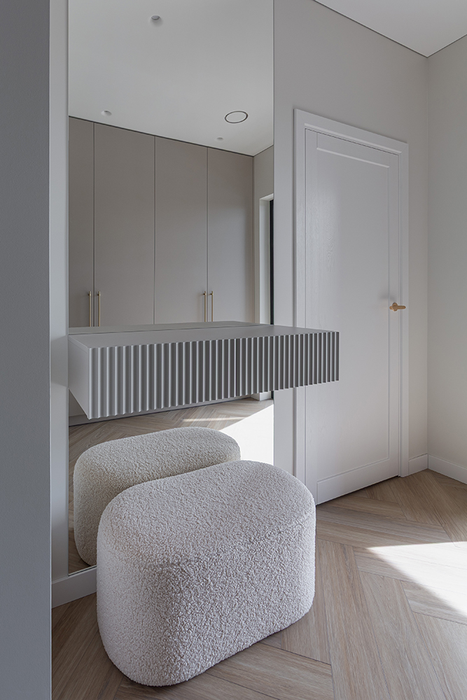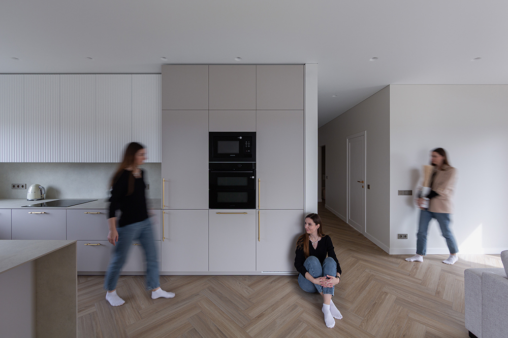 Interjero pagrindą formuoja šviesi spalvinė paletė, natūralios tekstūros ir švarios linijos. Erdvėse dominuoja estetiška ramybė, leidžianti atsiskleisti šviesai, proporcijoms ir medžiagų kokybei. Kiekvienas sprendimas apgalvotas taip, kad namai būtų ne tik gražūs, bet ir patogūs augančiai šeimai.