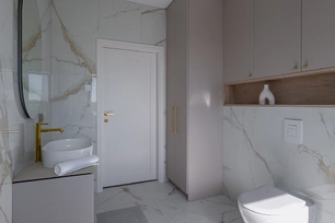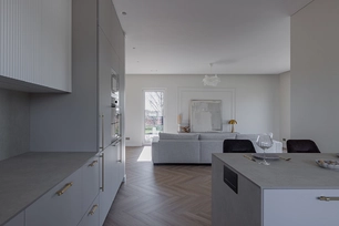 Cozy and bright house for a young family in Sutkūnai This interior project was born from the need of a young family to have a home where everyday life would be calm, bright and cozy. When creating the spaces, we sought not only aesthetics, but also a feeling - so that the house would become a place where you always want to return. Here, modern solutions subtly combine with warmth, naturalness and timeless elegance. The basis of the interior is formed by a light color palette, natural textures and clean lines. The spaces are dominated by aesthetic peace, allowing light, proportions and the quality of materials to unfold. Each solution is thought out so that the house would be not only beautiful, but also comfortable for a growing family. The panel chosen for the furniture finish is a matte, subtly silky surface, giving the interior a sense of sophistication and light luxury. This material is harmoniously combined with the compact countertop "Creamy Stone", whose warm, creamy tone enhances the feeling of integrity and creates visual balance in the entire interior. Great attention is paid not only to aesthetics, but also to practicality. The selected materials are resistant to daily use, easy to maintain and durable - this is especially important for the active rhythm of family life. Functional solutions here become a natural part of the interior, seamlessly blending into the overall design concept. The result is a modern, bright and cozy home that combines functionality, aesthetic peace and the lifestyle of a young family. An interior where every detail has its place, and the overall look remains light, harmonious and durable.