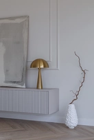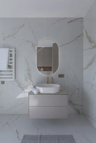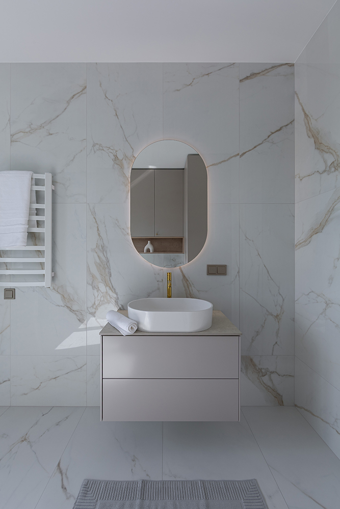 Baldų apdailai pasirinkta plokštė – matinio, subtiliai šilkinio paviršiaus, suteikianti interjerui rafinuotumo ir lengvos prabangos pojūtį. Ši medžiaga harmoningai derinama su compact stalviršiu „Kreminis akmuo“, kurio šiltas, kreminis tonas sustiprina vientisumo jausmą ir sukuria vizualinę pusiausvyrą visame interjere.