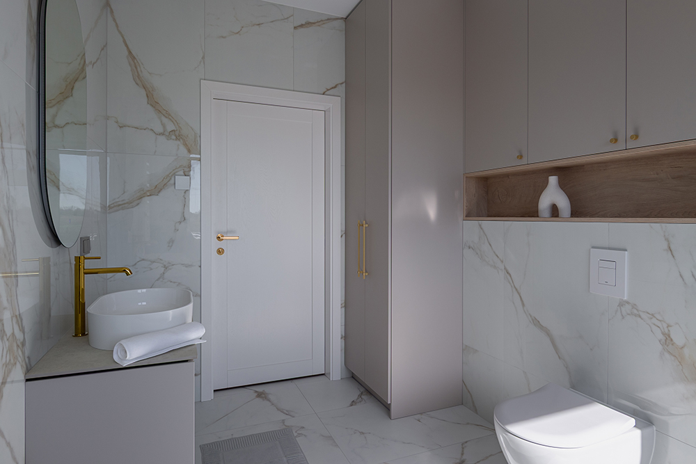 Didelis dėmesys skirtas ne tik estetikai, bet ir praktiškumui. Pasirinktos medžiagos yra atsparios kasdieniam naudojimui, lengvai prižiūrimos ir ilgaamžės – tai ypač svarbu aktyviam šeimos gyvenimo ritmui. Funkcionalūs sprendimai čia tampa natūralia interjero dalimi, nepastebimai įsiliejančia į bendrą dizaino koncepciją.