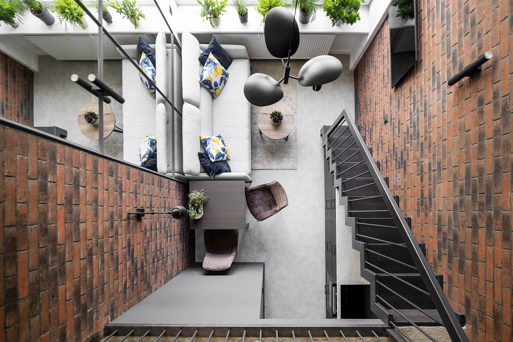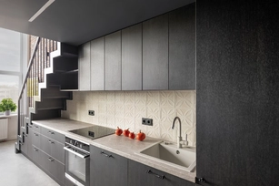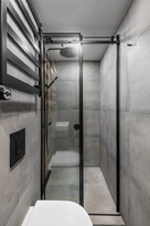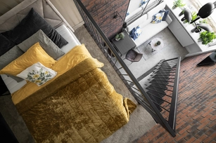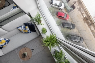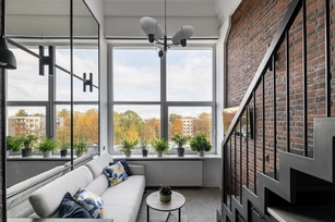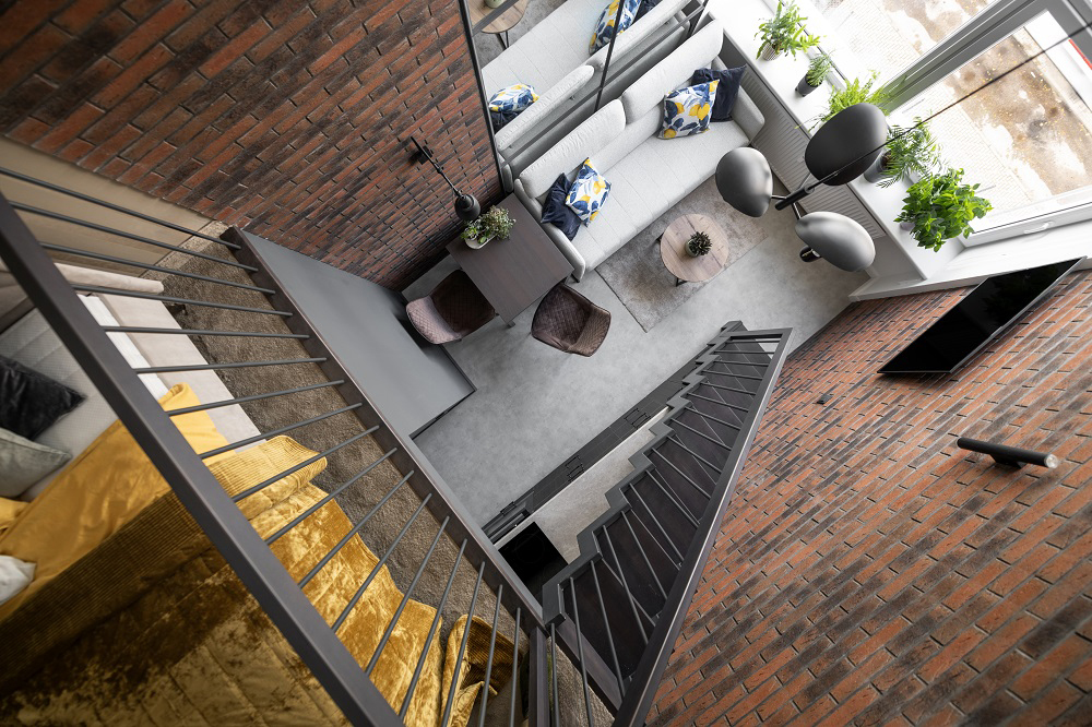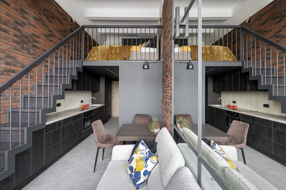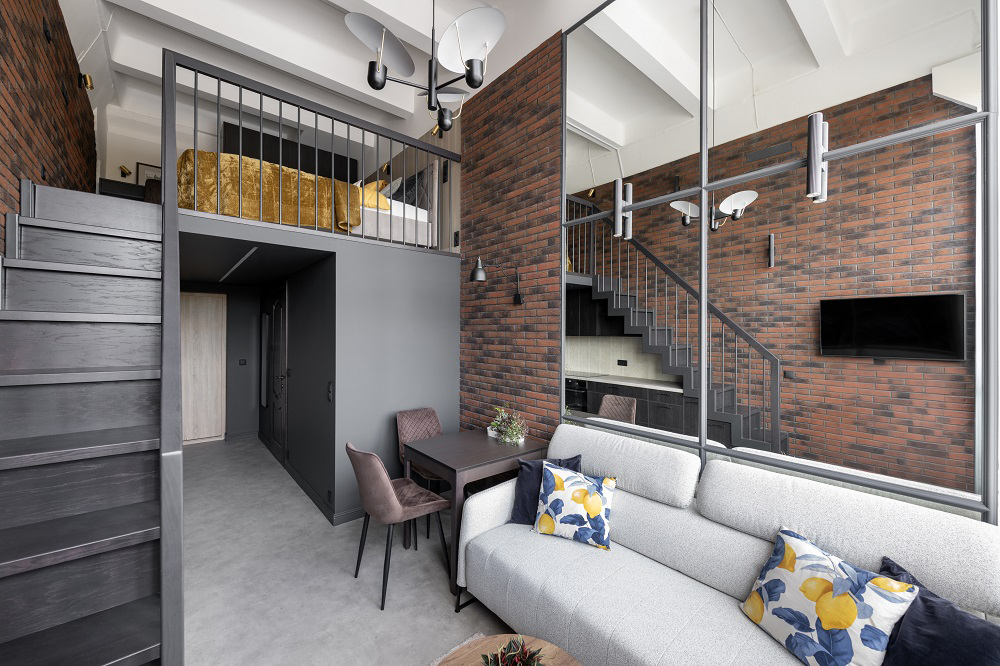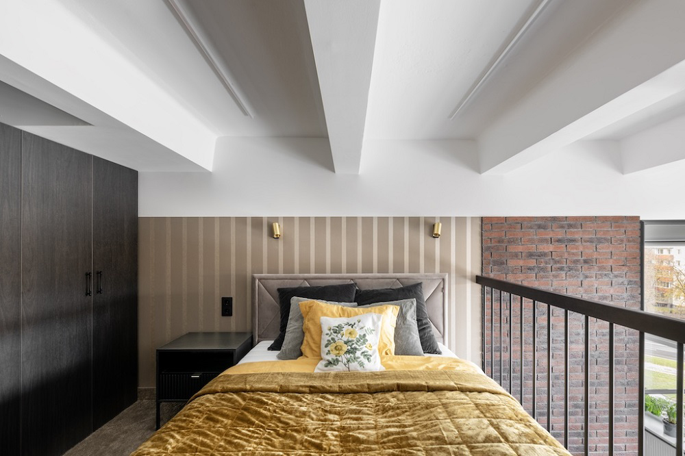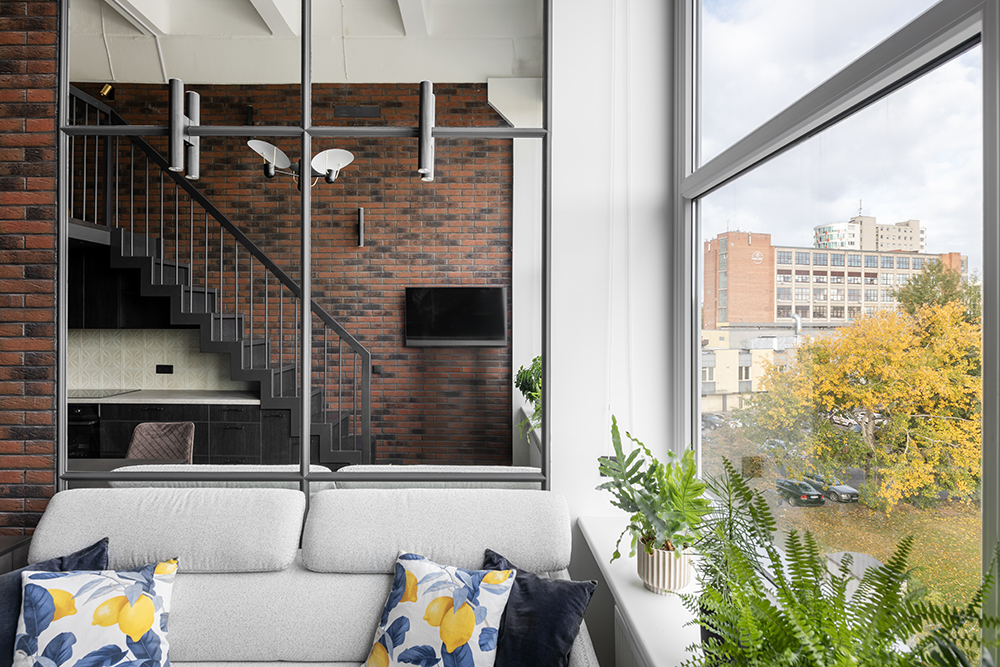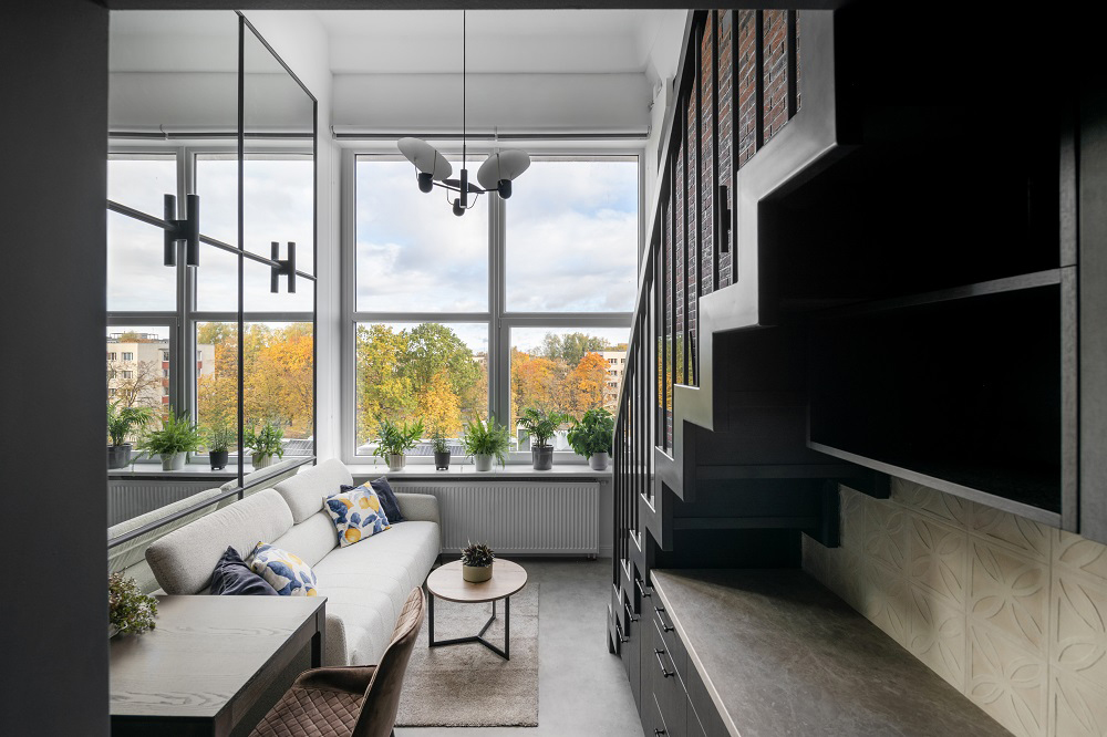 A loft for rent is located in a bustling area of Vilnius' Žirmūnai neighborhood. Everything you need for everyday life is contained in a very small space: a kitchen, dining area, living room, bathroom and washing machine, a bedroom with a desk and a spacious wardrobe. Natural light flows organically through the panoramic windows, breathing in the city's seasons and expanding life in a really small area.