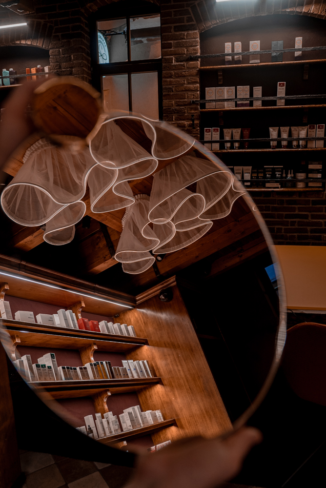 An artistic ceiling light installation subtly alludes to ancient notions of beauty, when luminous skin was associated with purity and grace. Dramatic draperies of heavy fabric conceal the private workspace in the attic above.
