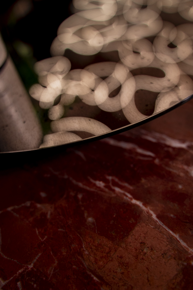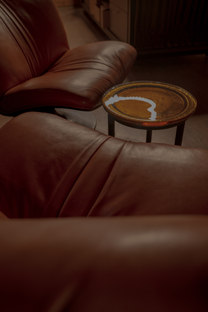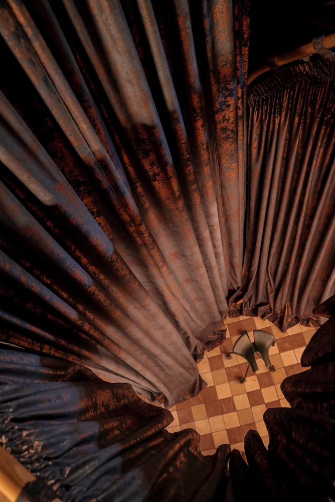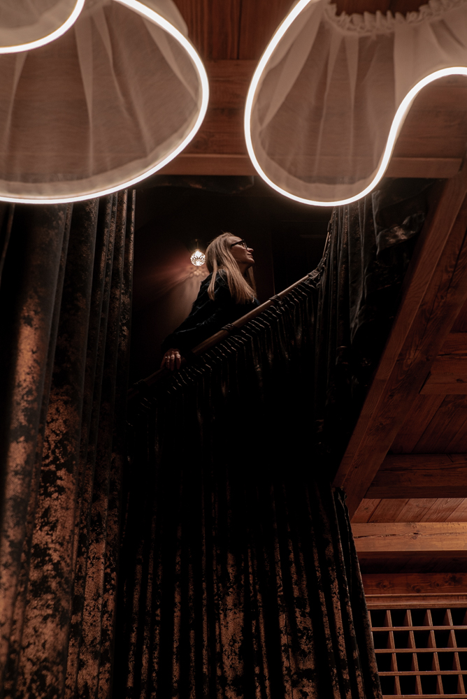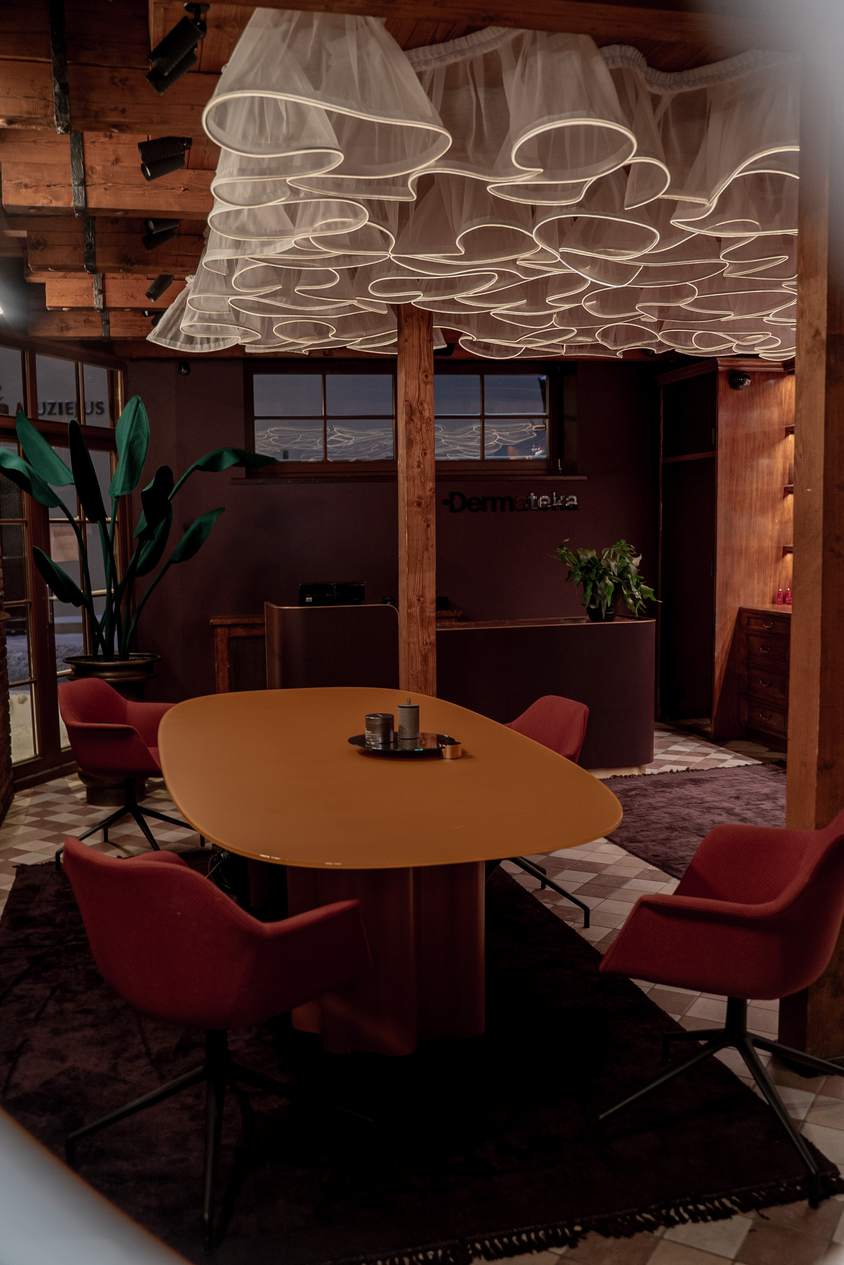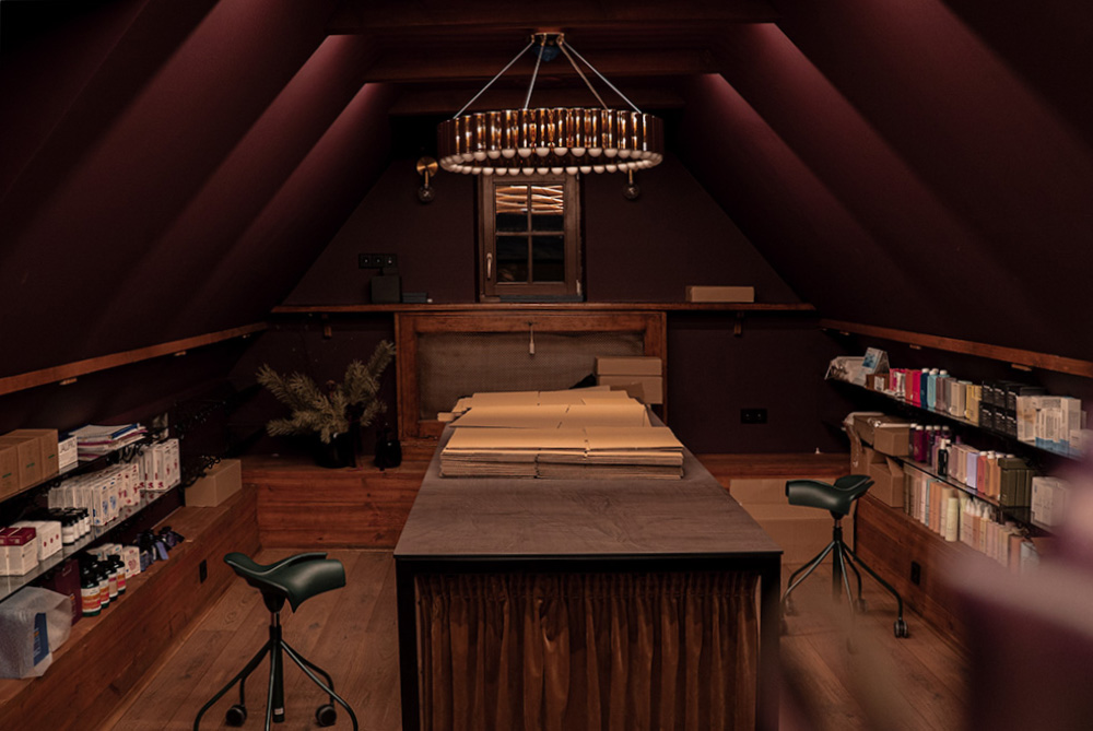 Meninė lubų apšvietimo instaliacija tarsi provokuojančiai primena, kad skaisti oda jau senais laikais buvo siejama su tyru moters grožiu. O dramatiškos tvirto audinio draperijos slepia privačią darbo erdvę palėpėje.