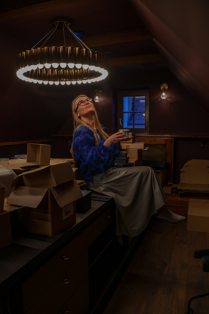The client wished every working area to feel inspiring, even the packing zone, where one should be able to enjoy the space and the process. The resulting atmosphere is relaxed and deliberately unlike a typical workplace: a theatrical chandelier creates a sense of grandeur and importance, while soft leather armchairs gently invite a moment of pause.