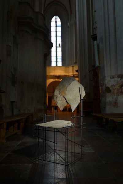 Vieną rytą, eidamas link autobuso stotelės, sustojau prie pastolių. Jų laikina, ritmiška struktūra mane sužavėjo – funkcionali, atvira ir trumpalaikė. Iš to susitikimo gimė ši kėdė. Naudodamas plonus plieno strypus, atkūriau pastolių lengvą, pasikartojančią tvarką. Jai subalansuoti panaudojau rastą granito fragmentą – šiurkštų, sunkų ir nešlifuotą. Kartu jie kuria dialogą: žmogaus sukurtas ritmas ir precizika susitinka su gamtos chaotiškumu ir amžinu svoriu.