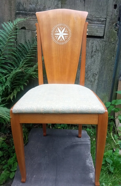 A chair from the living room furniture set. The complete living room furniture set consists of: a rectangular dining table, six semi-upholstered chairs, a cupboard, a sideboard, and inlays of sun motifs made from bone. Year: 1960.